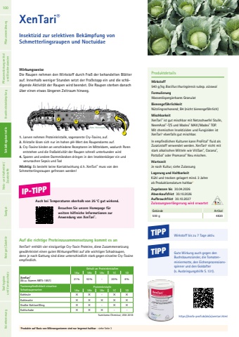 https://biofa-profi.de/de/x/xentari.html123 4XenTari%u00aeInsektizid zur selektiven Bek%u00e4mpfung von Schmetterlingsraupen und NoctuidaeWirkungsweiseDie Raupen nehmen den Wirkstoff durch Fra%u00df der behandelten Bl%u00e4tter auf. Innerhalb weniger Stunden setzt der Fra%u00dfstopp ein und die sch%u00e4digende Aktivit%u00e4t der Raupen wird beendet. Die Raupen sterben danach %u00fcber einen etwas l%u00e4ngeren Zeitraum hinweg.ProduktdetailsWirkstoff540 g / kg Bacillus thuringiensis subsp. aizawaiFormulierungWasserdispergierbares GranulatBienengef%u00e4hrlichkeit N%u00fctzlingsschonend; B4 (nicht bienengef%u00e4hrlich)MischbarkeitXenTari%u00ae ist gut mischbar mit Netzschwefel Stulln, NeemAzal%u00ae-T/S und Madex%u00ae MAX/Madex%u00ae TOP. Mit chemischen Insektiziden und Fungiziden ist XenTari%u00ae ebenfalls gut mischbar. In empfindlichen Kulturen kann ProFital%u00ae fluid als Zusatzstoff verwendet werden. XenTari%u00ae nicht mit stark alkalischen Mitteln wie VitiSan%u00ae, Cocana%u00ae, PottaSol%u00ae oder Promanal%u00ae Neu mischen.Wartezeit Je nach Kultur, siehe ZulassungLagerung und HaltbarkeitK%u00fchl und trocken gelagert mind. 3 Jahre ab Produktionsdatum haltbar*Zugelassen bis 30.04.2026Abverkaufsfrist 30.10.2026Aufbrauchfrist 30.10.2027Zulassungsverl%u00e4ngerung wird erwartetGebinde Artikel500 g 4820TIPP Gute Wirkung auch gegen den Buchsbaumz%u00fcnsler, die Tomatenminiermotte, den Eichenprozessionsspinner und den Goldafter(s. Ausbringungshilfe S.131).1. Larven nehmen Proteinkristalle, sogenannte Cry-Toxine, auf. 2. Kristalle l%u00f6sen sich nur im hohen pH-Wert des Raupendarms auf. 3. Cry-Toxine binden an verschiedene Rezeptoren im Mitteldarm, wodurch Poren entstehen und die Fra%u00dfaktivit%u00e4t der Raupen schnell unterbunden wird4. Sporen und andere Darmmikroben dringen in den Insektenk%u00f6rper ein und verursachen Sepsis und TodWichtig: Es besteht keine Kontaktwirkung d. h. XenTari%u00ae muss von denSchmetterlingsraupen gefressen werden!Auf die richtige Proteinzusammensetzung kommt es an XenTari%u00ae enth%u00e4lt vier einzigartige Cry-Toxin Proteine, diese Zusammensetzunggew%u00e4hrleistet einen guten Wirkungseffekt auf alle wichtigen Schadraupen, denn je nach Gattung sind diese unterschiedlich stark gegen einzelne Cry-Toxine empfindlich. Sumitomo Chemical, USA 2018Gehalt an Proteinkristallen1Aa 1Ab 1Ac 1C 1DXenTari%u00ae(B.t.a. Stamm ABTS-1857) 21% 53% - 20% 6%Toxinempfindlichkeit einzelner SchadraupenartenProteinkristalle1Aa 1Ab 1Ac 1C 1DKohleule %u2715 %u2715 - %u2715 %u2715Kohlmotte %u2715 %u2715 %u2715 %u2715 %u2715Gro%u00dfer Kohlwei%u00dfling %u2715 %u2715 - %u2715 %u2715Kohlschabe %u2715 %u2715 %u2715 - -*Produkte auf Basis von Mikroorganismen sind nur begrenzt haltbar - siehe Seite 3 Auch bei Temperaturen oberhalb von 25%u00b0C gut wirkend. Besuchen Sie unsere Homepage f%u00fcr weitere hilfreiche Informationen zur Anwendung von XenTari%u00ae. Wirkstoff bis zu 7 Tage aktiv.IP-TIPPTIPP100 Pflanzenern%u00e4hrung Pflanzenst%u00e4rkungsmittel und Biostimulanzien Krankheitsbek%u00e4mpfung Sch%u00e4dlingskontrolle Netz- und Haftmittel/ Zusatzstoffe Saatgut Reiniger/ Zubeh%u00f6r Sch%u00e4dlingskontrolle Stallhygiene und Vorratsschutz Keimhemmung