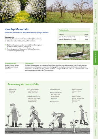 ProduktdetailsGebinde Artikelstandby-Mausefalle (1 St%u00fcck) 5987standby-Bodenplatte (1 St%u00fcck) 5988standby-MausefalleLebendfalle: Unterbindet die (R%u00fcck-)Einwanderung; geringer UnterhaltWirkungsweiseDer standby-M%u00e4usezaun unterbindet die (R%u00fcck-) Einwanderung der M%u00e4use. Die Kultur bleibt vor Neubefall verschont.%u2714 Die Lebendfangboxen werden von nat%u00fcrlichen Gegenspielern (Fuchs, Hauskatze, Hermelin, etc.) geleert%u2714 Anwendungsgebiete: Obstanlagen, Weinbau, Futterbau, Spezialkulturen (Beeren etc.)Anwendung der topcat-Falle%u2022 Mit SuchstabMausgangaufsp%u00fcren%u2022 Mit Lochschneidersauberes Loch inGang schneiden %u2022 Lose Erde entfernenoder mit dem Knaufdes Suchstabsflachdr%u00fccken%u2022 Falle platzieren%u2022 An der Oberfl%u00e4chemit Erde lichtundurchl%u00e4ssigabdichten%u2022 Falle spannen%u2022 topcat-Falle nacherfolgtem Fangleeren%u2022 topcat-Falle angleicher Stelle wiederplatzieren undspannenAnwendungsbereich WirkungsweiseObstbau, Wiesen, Weiden, Dauergr%u00fcnland, Feldbau, GartenbauDie (R%u00fcck-) Einwanderung von subadulten Tieren findet oberirdisch statt. M%u00e4use, welche in die Parzelle eindringen wollen, suchen am M%u00e4usezaun entlang einen Durchgang. Die standby-Boxen bieten den M%u00e4usen einen Zufluchtsort. Einmal in der standby-Box drin, kommen die M%u00e4use aus eigener Kraft nicht mehr heraus. Die nat%u00fcrlichen Feinde k%u00f6nnen die gefangenen M%u00e4use der Falle entnehmen.107 Pflanzenern%u00e4hrung Pflanzenst%u00e4rkungsmittel und Biostimulanzien Krankheitsbek%u00e4mpfung Sch%u00e4dlingskontrolle Netz- und Haftmittel/ Zusatzstoffe Saatgut Reiniger/ Zubeh%u00f6r Sch%u00e4dlingskontrolle Stallhygiene und Vorratsschutz Keimhemmung