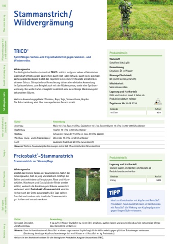 Stammanstrich/Wildvergr%u00e4mungWirkungsweiseDas biologische Verbissschutzmittel TRICO%u00ae sch%u00fctzt aufgrund seiner olfaktorischen Eigenschaft effektiv gegen Wildverbiss durch Rot- oder Rehwild. Durch seine optimale Witterungsbest%u00e4ndigkeit bietet das Repellent einen mehrere Monate anhaltenden sicheren Schutz. Die optimierte Formulierung sichert eine einfache Anwendung im Spritzverfahren, zum Beispiel auch mit der R%u00fcckenspritze, sowie eine Spr%u00fchanwendung. Die wei%u00dfe Farbe erm%u00f6glicht zus%u00e4tzlich eine zuverl%u00e4ssige Markierung der behandelten B%u00e4ume. Weitere Anwendungsgebiete: Weinbau, Raps, Soja, Sonnenblume, Hopfen.Die Schutzwirkung wird %u00fcber den repellenten Geruch erzielt. WirkungsweiseErsetzt das fr%u00fchere Kalken der Baumst%u00e4mme. N%u00e4hrt das Rindengewebe, h%u00e4lt es jung und elastisch. Kr%u00e4ftigt die Zellen und verhindert so Frostplatzen, Risse und Hitzesch%u00e4den. Wachstum und Elastizit%u00e4t der Rinde werden erh%u00f6ht, wodurch die Ern%u00e4hrung der B%u00e4ume wesentlich verbessert wird. Preicobakt%u00ae-Stammanstrich wird im Herbst nach der Ernte ausgebracht. Die Tage sollten frostfrei und trocken sein, damit der Stammanstrich gut haften und antrocknen kann.ProduktdetailsWirkstoffSchaffett (64,6 g /l)FormulierungEmulsion, %u00d6l in WasserBienengef%u00e4hrlichkeit B4 (nicht bienengef%u00e4rlich)MischbarkeitSolo anzuwendenLagerung und HaltbarkeitK%u00fchl und trocken mind. 2 Jahre ab Produktionsdatum haltbarZugelassen bis 31.08.2026Gebinde Artikel10 Liter 4211ProduktdetailsLagerung und HaltbarkeitTrocken lagern, mindestens 36 Monate ab Produktionsdatum haltbarGebinde Artikel25 kg 5814TRICO%u00aeSpritzf%u00e4higes Verbiss-und Fegeschutzmittel gegen Sommer- und WinterverbissPreicobakt%u00ae-StammanstrichStammanstrich zur StammpflegeIdeal zur Kombination mit Kupfer und PottaSol%u00ae: Preicobakt%u00ae-Stammanstrich kann in Kombination mit PottaSol%u00ae die Wirkung von Kupferpr%u00e4paraten gegen Kragenf%u00e4ule verbessern.TIPPKultur AnwendungAckerbau Mais 15 l/ha, Raps 15 l/ha, Sojabohne 15 l/ha, Sonnenblume 15 l/ ha in 200-300 l/ha Wasser Hopfenbau Hopfen 15 l/ha in 50 l/ ha WasserObstbau Schwarzer Holunder 15 l/ha in max. 50 l/ ha WasserWeinbau (Jung- und Ertragsanlagen) Weinrebe 15 l/ha in 50 l/ha WasserForst Laubholz, Nadelholz 20 l/ ha (unverd%u00fcnnt)Hinweis: Weitere Anwendungsbestimmungen siehe BVL Pflanzenschutzmittelverzeichnis Kultur AnwendungKernobst, Steinobst, Zierpflanzenbau1 kg auf 5 l Wasser (zun%u00e4chst zu einem Brei anr%u00fchren, quellen lassen und anschlie%u00dfend auf die notwendige Menge bzw. Konsistenz verd%u00fcnnen)Hinweis: Kann in Kombination mit PottaSol%u00ae + einem zugelassenen Kupferfungizid die Wirksamkeit gegen pilzliche Schaderreger verbessern.(Dosierung: ben%u00f6tigte Kupferaufwandmenge in l +4 l Wasser +1 l PottaSol%u00ae +1 kg Preicobakt%u00ae)Gelistet in der Betriebsmittelliste f%u00fcr die %u00f6kologische Produktion Ausgabe Deutschland (FiBL).108 Pflanzenern%u00e4hrung Pflanzenst%u00e4rkungsmittel und Biostimulanzien Krankheitsbek%u00e4mpfung Sch%u00e4dlingskontrolle Netz- und Haftmittel/ Zusatzstoffe Saatgut Reiniger/ Zubeh%u00f6r Sch%u00e4dlingskontrolle Stallhygiene und Vorratsschutz Keimhemmung