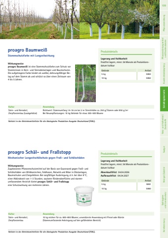 WirkungsweiseZugelassenes Pflanzenschutzmittel auf der Basis von Quarzsand gegen Fra%u00df- und Sch%u00e4lsch%u00e4den von Wildkaninchen, Feldhasen, Rotwild und Biber in Obstanlagen, Baumschulen und Ziergeh%u00f6lzen. Bei sorgf%u00e4ltiger Ausbringung, d. h. bei %u00fcber 8 %u00b0C, einer Abbindezeit von 1-3 Stunden, sauberer Rindenoberfl%u00e4che und stammumfassendem Anstrich bietet proagro Sch%u00e4l- und Fra%u00dfstoppeine Schutzwirkung von mehreren Jahren.ProduktdetailsLagerung und HaltbarkeitFrostfrei lagern, mind. 36 Monate ab Produktionsdatum haltbarAbverkaufsfrist 04.04.2026Aufbrauchfrist 04.04.2027Gebinde Artikel5 kg 586110 kg 5860proagro Sch%u00e4l- und Fra%u00dfstoppMechanischer Langzeitsch%u00e4lschutz gegen Fra%u00df- und Sch%u00e4lsch%u00e4denKultur AnwendungStein- und Kernobst; Zierpflanzenbau 10 kg reichen f%u00fcr ca. 600%u2013800 B%u00e4ume; unverd%u00fcnnte Anwendung mit Pinsel oder B%u00fcrste (Stammumfassende Anbringung auf den gef%u00e4hrdeten Bereich)Wirkungsweiseproagro Baumwei%u00df ist eine Stammschutzfarbe zum Schutz vor Stammrissen in Kern- und Steinobstanlagen und Baumschulen. Die aufgetragene Farbe bindet als wei%u00dfer, dehnungsf%u00e4higer Belag auf dem Stamm ab und sch%u00fctzt so %u00fcber einen Zeitraum von 4 bis 5 Jahren.ProduktdetailsLagerung und HaltbarkeitFrostfrei lagern, mind. 36 Monate ab Produktionsdatum haltbarGebinde Artikel5 kg 586310 kg 5862proagro Baumwei%u00dfStammschutzfarbe mit LangzeitwirkungKultur AnwendungStein- und Kernobst; Zierpflanzenbau (Laubgeh%u00f6lze)Richtwert: Stammumfang 14%u201316 cm bei 2 m Streichh%u00f6he ca. 250 g / Stamm oder 850 g /m2Bei Neuanpflanzungen: 10 kg Gebinde f%u00fcr etwa 300%u2013500 B%u00e4umeGelistet in der Betriebsmittelliste f%u00fcr die %u00f6kologische Produktion Ausgabe Deutschland (FiBL).Gelistet in der Betriebsmittelliste f%u00fcr die %u00f6kologische Produktion Ausgabe Deutschland (FiBL).109 Pflanzenern%u00e4hrung Pflanzenst%u00e4rkungsmittel und Biostimulanzien Krankheitsbek%u00e4mpfung Sch%u00e4dlingskontrolle Netz- und Haftmittel/ Zusatzstoffe Saatgut Reiniger/ Zubeh%u00f6r Sch%u00e4dlingskontrolle Stallhygiene und Vorratsschutz Keimhemmung