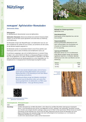 https://biofa-profi.de/de/s/steinernem-feltiaeapfelwickler-nematoden.htmlWirkungsweiseZur Bek%u00e4mpfung der %u00fcberwinternden Larven des Apfelwicklers.Apfelwickler-Nematoden (Steinernema feltiae) sind nat%u00fcrliche Feinde des Apfelwicklers, sie sind auf deren Larven spezialisiert und nutzen diese zur Ern%u00e4hrung und Fortpflanzung.Die Nematoden dringen %u00fcber K%u00f6rper%u00f6ffnungen in die Apfelwickler-Larve ein, sondern ein Bakterium ab, welches die Larve zersetzt, und vermehren sich dort weiter, bis das Wirtstier komplett aufgezehrt ist. Die Nematoden werden im Larvenstadium lebend in einem Pulver geliefert, nach Ausbringung suchen sie aktiv ihr Wirtstier, also die Apfelwicker-Larven, auf.Es wird davon ausgegangen, dass sich die Apfelwicklerlarven in normalen Ertragsanlagen in den unteren Bereich der B%u00e4ume zur Verpuppung /Diapause zur%u00fcckziehen. Ziel der Applikation ist es daher, die Baumst%u00e4mme zu behandeln. In der Regel sollte eine Behandlung ab der Veredlungsstelle bis zu einer Stammh%u00f6he von 1 m (Jungb%u00e4ume) bis 2 m (ausgewachsene Erwerbsanlagen) durchgef%u00fchrt werden.ProduktdetailsBek%u00e4mpft das Schaderregerstadium Apfelwickler-LarveAnwendungszeitraum Ausbringung: ab Ende September bzw. nach der Ernte der %u00c4pfelTemperaturbed%u00fcrfnisEinsatz der Nematoden idealerweise bei sehr hoher Luftfeuchtigkeit. Eine Feuchtedauer von 6 Stunden bei Temperaturen oberhalb von 8 %u00b0C ist notwendig.Lagerung und HaltbarkeitNematoden k%u00f6nnen bei 2-8 %u00b0C im K%u00fchlschrank einige Wochen gelagert werden. Das maximale Lagerdatum liegt bei ca. 4-6 Wochen. Optimale Ausbringung in den ersten zwei Wochen nach der Anlieferung.Gebinde Artikel250 Mio. 4995500 Mio. 4987nemapom%u00ae Apfelwickler-NematodenSteinernema feltiaeN%u00fctzlingeAnwendungsbereich Wirkungsstark gegenApfel ApfelwicklerAnwendung: 750 Mio. Nematoden / ha und Meter Baumh%u00f6he in 750 l Wasser/ ha und Meter Baumh%u00f6he; Ausbringung mit Spritzger%u00e4t (Druck < 5 bar, D%u00fcsen%u00f6ffnung mind. 0,8 mm), nach M%u00f6glichkeit mit Drall-, Hohlkegel- oder Injektord%u00fcsen. Spritzbr%u00fche innerhalb von 2 Stunden unter stetigem Umr%u00fchren ausbringen. Zusatz von 0,2 % Trifolio%u00ae S-forte oder Zentero%u00ae SPR (0,2 %) hat sich bew%u00e4hrt; Ausbringung: ab Ende September bzw. nach der Ernte der %u00c4pfel; idealerweise sollte der Einsatz der Nematoden nach einem Regen, bei Nieselregen oder Hochnebel erfolgen (sehr hohe Luftfeuchtigkeit). Eine Feuchtedauer von 12-24 Stunden bei Temperaturen oberhalb von 8 %u00b0C ist notwendig. Es sollte immer abends behandelt werden, nicht bei Sonnenschein!Es sollte immer abends behandelt werden, nicht bei Sonnenschein! Sollte bis Anfang /Mitte Oktober nicht ausreichend Niederschlag fallen, ist die Anwendung mit sehr hoher Wasseraufwandmenge durchzuf%u00fchren. Behandlung der Borke und ggf. des Erdbodens unterhalb der Baumkrone sowie die Baumkrone selbst, auch andere %u00dcberwinterungsm%u00f6glichkeiten des Apfelwicklers wie Pf%u00e4hle sowie Tonkinst%u00e4be beachten %u2013 hierzu ggf. Beratung einholen.TIPPVon Nematoden befallene Apfelwicklerlarve110 Pflanzenern%u00e4hrung Pflanzenst%u00e4rkungsmittel und Biostimulanzien Krankheitsbek%u00e4mpfung Sch%u00e4dlingskontrolle Netz- und Haftmittel/ Zusatzstoffe Saatgut Reiniger/ Zubeh%u00f6r Sch%u00e4dlingskontrolle Stallhygiene und Vorratsschutz Keimhemmung