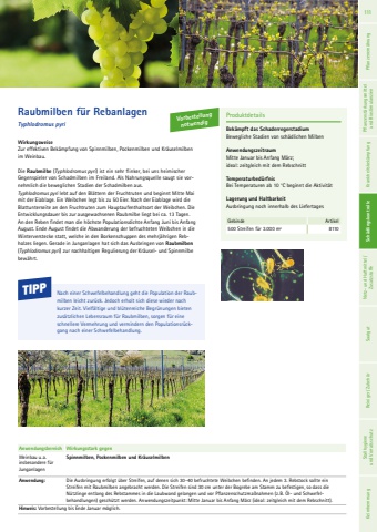 WirkungsweiseZur effektiven Bek%u00e4mpfung von Spinnmilben, Pockenmilben und Kr%u00e4uselmilben im Weinbau.Die Raubmilbe (Typhlodromus pyri) ist ein sehr flinker, bei uns heimischer Gegenspieler von Schadmilben im Freiland. Als Nahrungsquelle saugt sie vornehmlich die beweglichen Stadien der Schadmilben aus. Typhlodromus pyri lebt auf den Bl%u00e4ttern der Fruchtruten und beginnt Mitte Mai mit der Eiablage. Ein Weibchen legt bis zu 50 Eier. Nach der Eiablage wird die Blattunterseite an den Fruchtruten zum Hauptaufenthaltsort der Weibchen. Die Entwicklungsdauer bis zur ausgewachsenen Raubmilbe liegt bei ca. 13 Tagen. An den Reben findet man die h%u00f6chste Populationsdichte Anfang Juni bis Anfang August. Ende August findet die Abwanderung der befruchteten Weibchen in die Winterverstecke statt, welche in den Borkenschuppen des mehrj%u00e4hrigen Rebholzes liegen. Gerade in Junganlagen hat sich das Ausbringen von Raubmilben(Typhlodromus pyri) zur nachhaltigen Regulierung der Kr%u00e4usel- und Spinnmilbe bew%u00e4hrt.ProduktdetailsBek%u00e4mpft das Schaderregerstadium Bewegliche Stadien von sch%u00e4dlichen MilbenAnwendungszeitraum Mitte Januar bis Anfang M%u00e4rz; ideal: zeitgleich mit dem RebschnittTemperaturbed%u00fcrfnisBei Temperaturen ab 10 %u00b0C beginnt die Aktivit%u00e4tLagerung und HaltbarkeitAusbringung noch innerhalb des LiefertagesGebinde Artikel500 Streifen f%u00fcr 3.000 m2 8110Raubmilben f%u00fcr RebanlagenTyphlodromus pyriNach einer Schwefelbehandlung geht die Population der Raubmilben leicht zur%u00fcck. Jedoch erholt sich diese wieder nach kurzer Zeit. Vielf%u00e4ltige und bl%u00fctenreiche Begr%u00fcnungen bieten zus%u00e4tzlichen Lebensraum f%u00fcr Raubmilben, sorgen f%u00fcr eine schnellere Vermehrung und vermindern den Populationsr%u00fcckgang nach einer Schwefelbehandlung.TIPPAnwendungsbereich Wirkungsstark gegenWeinbau u. a. insbesondere f%u00fcr JunganlagenSpinnmilben, Pockenmilben und Kr%u00e4uselmilbenAnwendung: Die Ausbringung erfolgt %u00fcber Streifen, auf denen sich 30-40 befruchtete Weibchen befinden. An jedem 3. Rebstock sollte ein Streifen mit Raubmilben angebracht werden. Die Streifen sind 30 cm unter der Bogrebe am Stamm zu befestigen, so dass die N%u00fctzlinge entlang des Rebstammes in die Laubwand gelangen und vor Pflanzenschutzma%u00dfnahmen (z.B. %u00d6l- und Schwefelbehandlungen) gesch%u00fctzt werden. Anwendungszeitpunkt: Mitte Januar bis Anfang M%u00e4rz (ideal: zeitgleich mit dem Rebschnitt). Hinweis: Vorbestellung bis Ende Januar m%u00f6glich.Vorbestellung notwendig111 Pflanzenern%u00e4hrung Pflanzenst%u00e4rkungsmittel und Biostimulanzien Krankheitsbek%u00e4mpfung Sch%u00e4dlingskontrolle Netz- und Haftmittel/ Zusatzstoffe Saatgut Reiniger/ Zubeh%u00f6r Sch%u00e4dlingskontrolle Stallhygiene und Vorratsschutz Keimhemmung