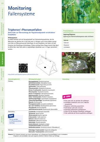 IP-TIPPMonitoringFallensystemeTripheron%u00ae-Pheromonfallen Delta-Falle zur %u00dcberwachung der Populationsdynamik verschiedener SchadfalterWirkungsweiseIm K%u00f6der befindet sich der Sexuallockstoff von Schmetterlingsweibchen, der die M%u00e4nnchen der gleichen Art in die Falle lockt. In Anlagen unter einem Hektar gen%u00fcgt eine Falle zur %u00dcberwachung des Falterfluges. Es wird empfohlen, die Fallen vor dem Einsetzen des Falterfluges aufzuh%u00e4ngen. Einige wichtige Arten fliegen bereits Ende April bis Mitte Mai. Jede Falle sollte in regelm%u00e4%u00dfigen Abst%u00e4nden von 2-3 Tagen kontrolliert werden.ProduktdetailsLagerung DispenserLagerung bei K%u00fchlschranktemperatur oder einfrierenGebindeFallensetDispenserLeimb%u00f6denAnwendungsbereich Wirkungsstark gegen AnwendungObstbau Birnengallm%u00fccke Contarinia pyrivora Apfelschalenwickler Adoxophyes oranaKirschbl%u00fctenmotte Argyresthia pruniellaApfelwickler Cydia pomonellaPflaumenwickler Grapholita funebranaKleiner Fruchtwickler Grapholita lovarzewskiiPfirsichwickler Grapholita molestaKleiner Frostspanner Operophtera brumataBodenseewickler Pammene rhediellaRotbr. Schalenwickler Pandemis heparanaApfelbaumglasfl%u00fcgler Synanthedon myopaeformisJohannisbeerglasfl%u00fcgler Synanthedon tipuliformisBlausieb Zeuzera pyrinaPfennigminiermotte Leucoptera malifoliellaSan-Jos%u00e9-Schildlaus Quadraspidiotus perniciosusPfirsichmotte Anarsia lineatellaApfelfaltenminiermotte Phyllonorycter blancardella%u2022 Falle jedes Jahr am gleichen Ort aufh%u00e4ngen%u2022 Leimb%u00f6den mindestens alle 2 bis 3 Wochen auswechseln%u2022 Dispenser rechtzeitig auswechseln%u2022 Fallenk%u00f6rper jedes Jahr erneuern%u2022 Falterfang w%u00f6chentlich protokollieren%u2022 Fallen f%u00fcr alle h%u00e4ufigen Schadfalter aufh%u00e4ngen%u2022 Falle au%u00dferhalb der Verwirrungsfl%u00e4che aufh%u00e4ngenGem%u00fcsebau Lauchmotte Acrolepiopsis assectellaYpsiloneule Agrotis ipsilonWintersaateule Agrotis segetumErbsenwickler Cydia nigricanaKohleule Mamestra brassicaeGem%u00fcseeule Mamestra oleraceaKohlschabe Plutella xylostellaZuckerr%u00fcbeneule Spodoptera exiguaTomatenminiermotte Tuta absolutaKohldrehherzm%u00fccke Contarinia nasturtii (PheroNorm%u00ae)Weinbau Einbindiger Traubenwickler Eupoecilia ambiguellaBekreuzter Traubenwickler Lobesia botranaHinweis: Ein Fallenset besteht aus einem Fallenk%u00f6rper mit 2 Dispensern (Lockstoffk%u00f6der) und 2 Leimb%u00f6den. Dispenser und Leimb%u00f6den sind auch separat erh%u00e4ltlich. Weitere Fallen auf Anfrage.https://biofa-profi.de/de/t/tripheron-pheromonfallen.htmlPro ha werden 2-4 Pheromonfallen ben%u00f6tigt.TIPP112 Pflanzenern%u00e4hrung Pflanzenst%u00e4rkungsmittel und Biostimulanzien Krankheitsbek%u00e4mpfung Sch%u00e4dlingskontrolle Netz- und Haftmittel/ Zusatzstoffe Saatgut Reiniger/ Zubeh%u00f6r Sch%u00e4dlingskontrolle Stallhygiene und Vorratsschutz Keimhemmung