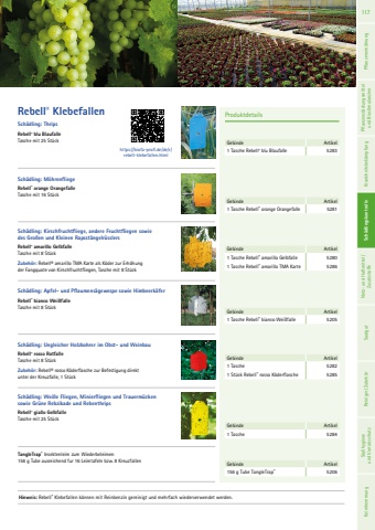 https://biofa-profi.de/de/r/rebell-klebefallen.htmlRebell%u00ae Klebefallen ProduktdetailsGebinde Artikel1 Tasche Rebell%u00ae blu Blaufalle 5283Gebinde Artikel1 Tasche Rebell%u00ae orange Orangefalle 5281Gebinde Artikel1 Tasche Rebell%u00ae amarillo Gelbfalle 52801 Tasche Rebell%u00ae amarillo TMA Karte 5286Gebinde Artikel1 Tasche Rebell%u00ae bianco Wei%u00dffalle 5205Gebinde Artikel1 Tasche 52821 St%u00fcck Rebell%u00ae rosso K%u00f6derflasche 5285Gebinde Artikel1 Tasche 5284Gebinde Artikel156 g Tube TangleTrap%u00ae 5206Sch%u00e4dling: ThripsRebell%u00ae blu BlaufalleTasche mit 25 St%u00fcckSch%u00e4dling: M%u00f6hrenfliegeRebell%u00ae orange OrangefalleTasche mit 16 St%u00fcckSch%u00e4dling: Kirschfruchtfliege, andere Fruchtfliegen sowie des Gro%u00dfen und Kleinen Rapsst%u00e4ngelr%u00fcsslersRebell%u00ae amarillo GelbfalleTasche mit 8 St%u00fcckZubeh%u00f6r: Rebell%u00ae amarillo TMA Karte als K%u00f6der zur Erh%u00f6hung der Fangquote von Kirschfruchtfliegen, Tasche mit 8 St%u00fcckSch%u00e4dling: Apfel- und Pflaumens%u00e4gewespe sowie Himbeerk%u00e4ferRebell%u00ae bianco Wei%u00dffalleTasche mit 8 St%u00fcckSch%u00e4dling: Ungleicher Holzbohrer im Obst- und WeinbauRebell%u00ae rosso RotfalleTasche mit 8 St%u00fcckZubeh%u00f6r: Rebell%u00ae rosso K%u00f6derflasche zur Befestigung direkt unter der Kreuzfalle, 1 St%u00fcckSch%u00e4dling: Wei%u00dfe Fliegen, Minierfliegen und Trauerm%u00fccken sowie Gr%u00fcne Rebzikade und RebenthripsRebell%u00ae giallo GelbfalleTasche mit 25 St%u00fcckTangleTrap%u00ae Insektenleim zum Wiederbeleimen156 g Tube ausreichend fur 16 Leimtafeln bzw. 8 KreuzfallenHinweis: Rebell%u00ae Klebefallen k%u00f6nnen mit Reinbenzin gereinigt und mehrfach wiederverwendet werden.117 Pflanzenern%u00e4hrung Pflanzenst%u00e4rkungsmittel und Biostimulanzien Krankheitsbek%u00e4mpfung Sch%u00e4dlingskontrolle Netz- und Haftmittel/ Zusatzstoffe Saatgut Reiniger/ Zubeh%u00f6r Sch%u00e4dlingskontrolle Stallhygiene und Vorratsschutz Keimhemmung