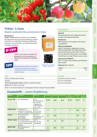 https://biofa-profi.de/de/t/ trifolio-s-forte.htmlProduktdetailsWirkstoff50 % pflanzliche %u00d6le, 50 % nichtionische Tenside auf Basis nachwachsender RohstoffeMischbarkeitMischungspartner mit Fungiziden sowie Baculoviruspr%u00e4paratenPflanzenvertr%u00e4glichkeitTrifolio%u00ae S-forte zeigt im Allgemeinen eine gute Pflanzenvertr%u00e4glichkeit. Bei der Behandlung sollte jedoch beachtet werden, dass Trifolio%u00ae S-forte zu 50 % aus pflanzlichen %u00d6len besteht. Im Zweifelsfall ist der Einsatz an wenigen Pflanzen vorab zu testen.Lagerung und Haltbarkeit%u00dcber 10 %u00b0C lagern, mind. 36 Monate ab Produktionsdatum haltbarZugelassen bis 12.06.2032Gebinde Artikel5 Liter 5110Trifolio%u00ae S-forte Netzmittel aus pflanzlichen %u00d6len und nichtionischen TensidenWirkungsweiseTrifolio%u00ae S-forte optimiert die Wirkung von Fungiziden. Der %u00f6lige Anteil sorgt f%u00fcr eine bessere Haftung, w%u00e4hrend die Tenside eine vollst%u00e4ndige Benetzung gew%u00e4hrleisten. Au%u00dferdem wird die Aufnahme von Pflanzenschutzmittelwirkstoffen unterst%u00fctzt. Kultur AnwendungObstbau, Zierpflanzenbau, Ackerbau 0,25%ig der Spritzbr%u00fche zusetzenFungizide 0,2-0,3 % zur Spritzbr%u00fcheF%u00fcr den konventionellen Anbau: Herbizide und Wachstumsregler 0,2-0,3 % zur Spritzbr%u00fcheHinweis: Nicht an Birnen anwendenTIPP %u00d6lhaltige Pr%u00e4parate k%u00f6nnen bei niedrigen Temperaturen ausflocken. Vor der Anwendung daher ggf. auf Raumtemperatur erw%u00e4rmen lassen.Gelistet in der Betriebsmittelliste f%u00fcr die %u00f6kologische Produktion Ausgabe Deutschland (FiBL).IP-TIPPTrifolio%u00ae S-forte senkt sich zwischen die Blatth%u00e4rchen ab und bringt damit die Wirkstoffe zuverl%u00e4ssig auf die Blattoberfl%u00e4che.Zusatzstoffe %u2013 unsere Empfehlung1 Retention: Haftf%u00e4higkeit eines Spritztropfens beim ersten Kontakt mit pflanzlicher Oberfl%u00e4cheProdukt Inhaltsstoff Dosierung Retention1 Spreitung Penetration RegenfestigkeitVertr%u00e4glichkeitFiBL gelistetZentero%u00ae SPR 45 % Sophorolipide 0,2 % (unter Beachtung der maximal zugelassenen Aufwandmenge von 1 l/ha)%u2714ProFital%u00ae fluid Tensoprot M: 1 % (nat%u00fcrliches Proteintensid auf Basis von Milcheiwei%u00df)0,15 % (150 ml/100 l Spritzbr%u00fche)%u2714Cocana%u00ae 270 g /l Kaliumsalzevon Fetts%u00e4uren,40 g /l Ethanol0,2-0,5 % (200-500 ml/100 l Spritzbr%u00fche)%u2714Trifolio%u00ae S-forte 50 % pflanzliche %u00d6le, 50 % nichtionische Tenside auf Basis nachwachsender Rohstoffe0,25 % (250 ml/100 l Spritzbr%u00fche)%u2714WETCIT%u00aeNEO Ethylenethoxylat und Pflanzen%u00f6le %u2714119 Pflanzenern%u00e4hrung Pflanzenst%u00e4rkungsmittel und Biostimulanzien Krankheitsbek%u00e4mpfung Sch%u00e4dlingskontrolle Netz- und Haftmittel/ Zusatzstoffe Saatgut Reiniger/ Zubeh%u00f6r Netz- und Haftmittel/ Zusatzstoffe Stallhygiene und Vorratsschutz Keimhemmung
