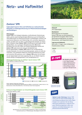 https://biofa-profi.de/de/z/zentero-spr.htmlNetz- und HaftmittelWirkungsweiseZentero%u00ae SPR ist ein biologisch abbaubares, multifunktionales Tankmischungsadditiv, welches sowohl die Regenfestigkeit (Sticker) als auch die Wirkstoffaufnahme (Penetration) von Pflanzenschutzmitteln und Blattd%u00fcngern verbessert. Der angetrocknete Belag kann durch Niederschl%u00e4ge nicht unmittelbar abgewaschen werden und bildet somit vor allem in niederschlagsreichen Perioden ein sicheres Depot. Au%u00dferdem steigert Zentero%u00ae SPR die Anhaftung der Spritztropfen auf der Blattoberfl%u00e4che, was zu geringeren Abtropfverlusten f%u00fchrt (Retention). Bei Wasserstress und unter hei%u00dfen und trockenen Bedingungen zeichnet sich Zentero%u00ae SPR zudem durch seine sehr gute Vertr%u00e4glichkeit aus. Bei den Sophorolipiden in Zentero%u00ae SPR handelt es sich um Biotenside der neuesten Generation. Sie sind ein Fermentationsprodukt, welches mit Hilfe des nat%u00fcrlichen, nicht-pathogenen Bakteriums Starmerella bombicola aus Zucker und heimischen %u00d6len gewonnen wird. In Zentero%u00ae SPR werden f%u00fcr die Produktion der Sophorolipide somit keine tropischen %u00d6le wie z. B. Palm%u00f6l eingesetzt, welches h%u00e4ufig ein Ausgangsrohstoff in der Tensidproduktion ist. ProduktdetailsWirkstoff45 % Sophorolipide MischbarkeitMischungspartner mit Fungiziden. Zentero%u00ae SPR immer als letzte Komponente der Spritzbr%u00fche hinzugeben. Bisher sind keine Mischungsunvertr%u00e4glichkeiten mit anderen Pflanzenschutz- oder D%u00fcngemitteln bekannt. Lagerung und HaltbarkeitNicht unter 4 %u00b0C lagern, mind. 24 Monate ab Produktionsdatum haltbarGebinde Artikel1 Liter 360110 Liter 3602Zentero%u00ae SPR Sophorolipid-basiertes Netz-und Haftmittel aus nachwachsenden Rohstoffen zur Wirkungsverbesserung von Pflanzenschutzanwendungen und Blattd%u00fcngernTIPPOptimal in jeder Wetterlage: Zentero%u00ae SPR sichert auch bei starken Niederschl%u00e4gen und unter Beregnung aufgrund seiner hohen Regenfestigkeit einen optimalen Halt des Belags. Gleichzeitig gew%u00e4hrleistet es aufgrund seiner guten Pflanzenvertr%u00e4glichkeit, selbst unter trockenen und hei%u00dfen Bedingungen, eine pflanzenschonende Behandlung.Wirkungsabsicherung von VitiSan%u00ae durch Zentero%u00aeSPREchter Mehltau an Erdbeeren (NL, 2022)Quelle: Andermatt Niederlande & Botany NV Leitlinie: GEP-Versuch (Gew%u00e4chshaus); Behandlungstermine ABCDE: A:15.09, B:22.09, C: 29.09, D: 06.10, E:13.10; Boniturtermine:15.09, 22.09, 29.09, 06.10, 13.10, 20.10 (nur letzter Termin dargestellt)020801004060Unbehandelt 3 x Penconazol (100 g /l)CDE5 x VitiSan%u00ae (3 kg / ha)ABCDE5 x VitiSan%u00ae (3 kg / ha)+ 0,2 % Zentero%u00ae SPRABCDE Befallsh%u00e4ufigkeit (%) Befallsst%u00e4rke (%) Wirkungsgrad (%)75%95%IP-TIPP Ihre Vorteile auf eine Blick+ mehr Regenfestigkeit+ h%u00f6here Mittelaufnahme+ bessere Feinverteilung+ Wirkstoffdepot bildend+ geringere AbtropfverlusteVerbesserte Regenfestigkeit von Schwefelfungiziden durch Zentero%u00aeSPRGegen Echten Mehltau in WeinBlattsegmenttest unter Laborbedingungen; Befallsbonitur 2 Wochen nach Behandlung; Durchschnittswerte aus 13 Wiederholungen; Wirkstoffgehalt Schwefel: 80 %100806040200Unbehandelte KontrolleSchwefel 1000 ppm Schwefel 1000 ppm Ohne Niederschlag 25 mm Niederschlag Schwefel 1000 ppm + Zentero%u00ae SPR0,2 % Schwefel 1000 ppm + Zentero%u00ae SPR0,2 % Befallsst%u00e4rke (%)97456910 8120 Pflanzenern%u00e4hrung Pflanzenst%u00e4rkungsmittel und Biostimulanzien Krankheitsbek%u00e4mpfung Sch%u00e4dlingskontrolle Netz- und Haftmittel/ Zusatzstoffe Saatgut Reiniger/ Zubeh%u00f6r Netz- und Haftmittel/ Zusatzstoffe Stallhygiene und Vorratsschutz Keimhemmung