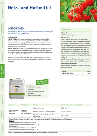 Netz- und HaftmittelWirkungsweiseWETCIT%u00ae NEO enth%u00e4lt neben dem Alkoholethoxylat auch pflanzliche %u00d6le. Neben einer sehr feinen Verteilung der Mittel auf der Pflanzeoberfl%u00e4che und dem Erreichen schwer zug%u00e4nglicher Pflanzenteile, wird dadurch auch eine hohe Anlagerung gew%u00e4hrleistet. Diese wird unterst%u00fctzt durch eine schnelle Antrocknung des Spritzbelages.WETCIT%u00ae NEO verf%u00fcgt %u00fcber die TransPhloem Technologie. Diese sorgt f%u00fcr eine hohe Aufnahmerate durch die Epidermis und einen schnellen Mittelzugang zum Phloem, was eine optimale Verteilung systemischer Pflanzenschutzmittel innerhalb der Pflanze mit sich bringt.Dar%u00fcber hinaus verf%u00fcgt WETCIT%u00ae NEO %u00fcber einen Wiederbenetzungseffekt, der 1-2 Wochen nach der Anwendung ein schnelles Abtrocknen der Bl%u00e4tter sicherstellt. Anmerkungen%u2022 Kein Einsatz im Obstbau genehmigt%u2022 Kein Einsatz mit Insektiziden genehmigt%u2022 FiBL-Listung vorhandenProduktdetailsWirkstoff8,15 % Alkoholetoxylat MischbarkeitWETCIT%u00ae NEO ist grunds%u00e4tzlich gut mischbar mit VitiSan%u00ae/NATRISAN%u00ae, Kupfer- und Schwefelp%u00e4paraten jedoch nicht mit Botector. Ausbringung zusammen mit Netzschwefel und VitiSan%u00ae/NATRISAN%u00ae bei hohen Temperaturen im Freiland vermeiden. Gleiches gilt f%u00fcr die Ausbringung mit Schwefel unter Glas. F%u00fcr den IP-Bereich: Mit den g%u00e4ngigen Fungiziden gut mischbar und, entsprechend konzentriert, die Aufnahmerate von systemischen Fungiziden/Herbiziden erh%u00f6hend. Ggf. Beratung zur Mischbarkeit einholen. Immer als letzten Bestandteil dem fast vollen Tank zugeben. Lagerung und HaltbarkeitFrostfrei lagern, mindestens 24 Monat haltbar ab ProduktionsdatumGebinde ArtikelWETCIT%u00aeNEO 5 Liter 4002WETCIT%u00aeNEONetzmittel zur Absicherung von Pflanzenschutzmittelanwendungen mit Reduktion von SpritzfleckenNeue Rezeptur mit AntifoamKulturen Produkttypen Funktion Konzentration in finaler Spritzbr%u00fcheAcker-, Gem%u00fcse-, Wein- und HopfenbauFungizide, Herbizide,WachstumsreglerSpreiten, Benetzen 0,05 - 0,15%Spreiten, Benetzen + Wiederbenetzen > 0,15-< 0,25%Spreiten, Benetzen, Wiederbenetzen + Penetration 0,25 - 0,30%Hinweis f%u00fcr den Einsatz im Hopfen- und Weinbau in Verbindung mit Wachstumsreglern und Fungiziden:Weinbau:Aufwandmenge bei Einfachanwendung: 0,25 % Aufwandmenge bei Mehrfachanwendungen: 0,17 %Hopfenanbau:Aufwandmenge bei Einfachanwendung: 0,14 %Aufwandmenge bei Mehrfachanwendungen: 0,1 %Gelistet in der Betriebsmittelliste f%u00fcr die %u00f6kologische Produktion Ausgabe Deutschland (FiBL).122 Pflanzenern%u00e4hrung Pflanzenst%u00e4rkungsmittel und Biostimulanzien Krankheitsbek%u00e4mpfung Sch%u00e4dlingskontrolle Netz- und Haftmittel/ Zusatzstoffe Saatgut Reiniger/ Zubeh%u00f6r Netz- und Haftmittel/ Zusatzstoffe Stallhygiene und Vorratsschutz Keimhemmung
