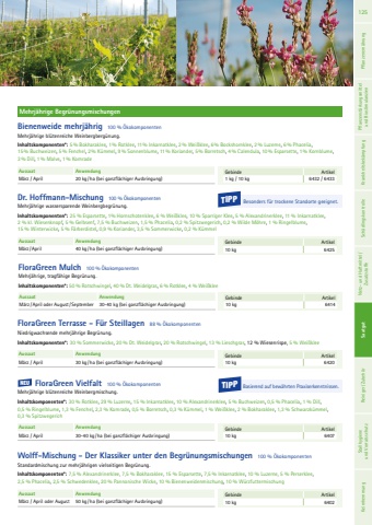Dr. Hoffmann-Mischung 100 % %u00d6kokomponentenMehrj%u00e4hrige wassersparende Weinbergbegr%u00fcnung.Inhaltskomponenten*: 25 % Esparsette, 1% Hornschotenklee, 6 % Wei%u00dfklee, 10 % Sparriger Klee, 5 % Alexandrinerklee, 11 % Inkarnatklee,2 % kl. Wiesenknopf, 5 % Gelbsenf, 7,5 % Buchweizen, 1,5 % Phacelia, 0,2 % Spitzwegerich, 0,2 % Wilde M%u00f6hre, 1 % Ringelblume,15 % Winterwicke, 5 % F%u00e4rberdistel, 0,9 % Koriander, 3,5 % Sommerwicke, 0,2 % K%u00fcmmelAussaat AnwendungM%u00e4rz /April 40 kg /ha (bei ganzfl%u00e4chiger Ausbringung)Gebinde Artikel10 kg 6425FloraGreen Terrasse - F%u00fcr Steillagen 88 % %u00d6kokomponenten Niedrigwachsende mehrj%u00e4hrige Begr%u00fcnung.Inhaltskomponenten*: 30 % Sommerwicke, 20 % Dt. Weidelgras, 20 % Rotschwingel, 13 % Lieschgras, 12 % Wiesenrispe, 5 % Wei%u00dfkleeAussaat AnwendungM%u00e4rz / April 30 kg /ha (bei ganzfl%u00e4chiger Ausbringung)Gebinde Artikel10 kg 6420Bienenweide mehrj%u00e4hrig 100 % %u00d6kokomponentenMehrj%u00e4hrige bl%u00fctenreiche Weinbergberg%u00fcnung.Inhaltskomponenten*: 5% Bokharaklee, 1% Rotklee, 11% Inkarnatklee, 2% Wei%u00dfklee, 6% Bockshornklee, 2% Luzerne, 6% Phacelia, 15% Buchweizen, 5% Fenchel, 2% K%u00fcmmel, 9% Sonnenblume, 11% Koriander, 5% Borretsch, 4% Calendula, 10% Esparsette, 1% Kornblume, 3% Dill, 1% Malve, 1% KornradeAussaat AnwendungM%u00e4rz / April 20 kg /ha (bei ganzfl%u00e4chiger Ausbringung)Gebinde Artikel1 kg / 10 kg 6432 / 6433TIPP Besonders f%u00fcr trockene Standorte geeignet.Mehrj%u00e4hrige Begr%u00fcnungsmischungen FloraGreen Vielfalt 100 % %u00d6kokomponentenMehrj%u00e4hrige bl%u00fctenreiche Weinbergmischung.Inhaltskomponenten*: 30 % Rotklee, 29 % Luzerne, 15 % Inkarnatklee, 10 % Alexandrinerklee, 5 % Buchweizen, 0,5 % Phacelia, 1 % Dill,0,5 % Ringelblume, 1,3 % Fenchel, 2,3 % Kornrade, 0,5 % Borretsch, 0,3 % K%u00fcmmel, 1 % Wei%u00dfklee, 2 % Bokharaklee, 1,3 % Schwarzk%u00fcmmel,0,3 % SpitzwegerichAussaat AnwendungM%u00e4rz / April 30-40 kg / ha (bei ganzfl%u00e4chiger Ausbringung)Gebinde Artikel10 kg 6407Wolff-Mischung - Der Klassiker unter den Begr%u00fcnungsmischungen 100 % %u00d6kokomponenten Standardmischung zur mehrj%u00e4hrigen vielseitigen Begr%u00fcnung.Inhaltskomponenten*: 7,5 % Alexandrinerklee, 7,5 % Bokharaklee, 15 % Esparsette, 7,5 % Inkarnatklee, 10 % Luzerne, 5 % Perserklee, 2,5 % Phacelia, 2,5 % Schwedenklee, 20 % Pannonische Wicke, 10 % Bienenweidenmischung, 10 % W%u00fcrzfuttermischungAussaat AnwendungM%u00e4rz / April oder August 50 kg /ha (bei ganzfl%u00e4chiger Ausbringung)Gebinde Artikel10 kg 6402FloraGreen Mulch 100 % %u00d6kokomponentenMehrj%u00e4hrige, tragf%u00e4hige Begr%u00fcnung.Inhaltskomponenten*: 50 % Rotschwingel, 40 % Dt. Weidelgras, 6 % Rotklee, 4 % Wei%u00dfkleeAussaat AnwendungM%u00e4rz /April oder August/ September 30-40 kg (bei ganzfl%u00e4chiger Ausbringung)Gebinde Artikel10 kg 6414NEUTIPP Basierend auf bew%u00e4hrten Praxiserkenntnissen.125 Pflanzenern%u00e4hrung Pflanzenst%u00e4rkungsmittel und Biostimulanzien Krankheitsbek%u00e4mpfung Sch%u00e4dlingskontrolle Netz- und Haftmittel/ Zusatzstoffe Saatgut Reiniger/ Zubeh%u00f6r Saatgut Stallhygiene und Vorratsschutz Keimhemmung