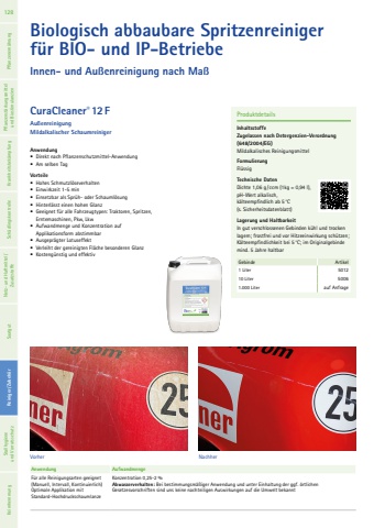 CuraCleaner%u00ae12FAu%u00dfenreinigung Mildalkalischer SchaumreinigerAnwendung Aufwandmenge F%u00fcr alle Reinigungsarten geeignet(Manuell, Intervall, Kontinuierlich)Optimale Applikation mit Standard-Hochdruckschaumlanze Konzentration 0,25-2 %Abwasserverhalten: Bei bestimmungsm%u00e4%u00dfiger Anwendung und unter Einhaltung der ggf. %u00f6rtlichen Gesetzesvorschriften sind uns keine nachteiligen Auswirkungen auf die Umwelt bekanntVorher NachherAnwendung%u2022 Direkt nach Pflanzenschutzmittel-Anwendung %u2022 Am selben TagVorteile%u2022 Hohes Schmutzl%u00f6severhalten %u2022 Einwirkzeit 1-5 min%u2022 Einsetzbar als Spr%u00fch- oder Schauml%u00f6sung%u2022 Hinterl%u00e4sst einen hohen Glanz%u2022 Geeignet f%u00fcr alle Fahrzeugtypen: Traktoren, Spritzen, Erntemaschinen, Pkw, Lkw%u2022 Aufwandmenge und Konzentration auf Applikationsform abstimmbar%u2022 Ausgepr%u00e4gter Lotuseffekt %u2022 Verleiht der gereinigten Fl%u00e4che besonderen Glanz%u2022 Kosteng%u00fcnstig und effektivProduktdetailsInhaltsstoffe Zugelassen nach Detergenzien-Verordnung (648/2004/EG)Mildalkalisches ReinigungsmittelFormulierung Fl%u00fcssigTechnische DatenDichte 1,06 g / ccm (1kg = 0,94 l), pH-Wert alkalisch,k%u00e4lteempfindlich ab 5%u00b0C(s. Sicherheitsdatenblatt)Lagerung und HaltbarkeitIn gut verschlossenen Gebinden k%u00fchl und trocken lagern; frostfrei und vor Hitzeeinwirkung sch%u00fctzen;K%u00e4lteempfindlichkeit bei 5 %u00b0C; im Originalgebinde mind. 5 Jahre haltbarGebinde Artikel1 Liter 501210 Liter 50061.000 Liter auf AnfrageBiologisch abbaubare Spritzenreiniger f%u00fcr BIO- und IP-BetriebeInnen- und Au%u00dfenreinigung nach Ma%u00df128 Pflanzenern%u00e4hrung Pflanzenst%u00e4rkungsmittel und Biostimulanzien Krankheitsbek%u00e4mpfung Sch%u00e4dlingskontrolle Netz- und Haftmittel/ Zusatzstoffe Saatgut Mauerbienen Reiniger/ Zubeh%u00f6r Stallhygiene und Vorratsschutz Keimhemmung