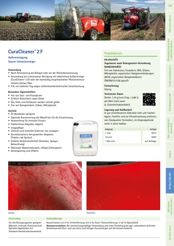CuraCleaner%u00ae2FAu%u00dfenreinigung Saurer IntensivreinigerVorher NachherAnwendung%u2022 Nach Antrocknung des Belages oder vor der Winterkonservierung%u2022 Anwendung bei unterlassener Reinigung mit alkalischem Au%u00dfenreiniger (CuraCleaner%u00ae 12 F) oder bei hartn%u00e4ckig eingetrockneten Pflanzenschutzmitteln / Fetten /%u00d6len%u2022 Z.B. am n%u00e4chsten Tag wegen schlechtwettertechnischer UnterbrechungBesondere Eigenschaften%u2022 Frei von Salz- und Flusss%u00e4uren%u2022 Entfernt Kesselstein sowie Oxide%u2022 %u00d6le, Fette und Fetts%u00e4uren werden schnell gel%u00f6st%u2022 Frei von Nanopartikeln, Silikon, Mikroplastik Vorteile%u2022 %u00d6l-Abscheider geeignet%u2022 Optimale Konservierung der Maschinen f%u00fcr die Einwinterung%u2022 Vorbereitung f%u00fcr erneuten Einsatz%u2022 Fleckenfreies Absp%u00fclen m%u00f6glich%u2022 Imagepflege%u2022 Sicheres und schnelles Erkennen von Leckagen%u2022 Korrosionsschutz des gesamten Gespanns (Traktor und Spritze)%u2022 Erh%u00f6hte Verkehrssicherheit (Scheiben, Spiegel, Beleuchtung)%u2022 Minimaler Wasserverbrauch, infolge Zeitersparnis%u2022 Kosteng%u00fcnstig und effektivProduktdetailsInhaltsstoffe Zugelassen nach Detergenzien-Verordnung (648/2004/EG)Frei von Salzs%u00e4uren, Flusss%u00e4ure, NTA, Silikon, Mikroplastik, organischen Halogenverbindungen (AOX), organischen Komplexbildnern%u00d6NORM B 5106 gepr%u00fcftFormulierung Fl%u00fcssigTechnische DatenDichte 1,16 g / ccm (1kg = 0,86 l),pH-Wert stark sauer(s. Sicherheitsdatenblatt)Lagerung und HaltbarkeitIn gut verschlossenen Gebinden k%u00fchl und trocken lagern, frostfrei und vor Hitzeeinwirkung sch%u00fctzen,von Z%u00fcndquellen fernhalten; im Originalgebinde mind. 5 Jahre haltbarGebinde Artikel1 Liter 501310 Liter 50071.000 Liter auf AnfrageAnwendung Aufwandmenge F%u00fcr alle Reinigungsarten geeignet(Manuell, Intervall, Kontinuierlich)Optimale Applikation mit Standard-Hochdruckschaumlanze Konzentration 0,5-5 %; Fettentfernung: 0,5-5 %; Oxid- / Steinentfernung: 3-20 % (Spezialfall)Abwasserverhalten: Bei bestimmungsm%u00e4%u00dfiger Anwendung und unter Einhaltung der ggf. vorhandenen %u00f6rtlichen Gesetzesvorschriften, sind uns keine nachteiligen Auswirkungen auf die Umwelt bekannt129 Pflanzenern%u00e4hrung Pflanzenst%u00e4rkungsmittel und Biostimulanzien Krankheitsbek%u00e4mpfung Sch%u00e4dlingskontrolle Netz- und Haftmittel/ Zusatzstoffe Saatgut Mauerbienen Reiniger/ Zubeh%u00f6r Stallhygiene und Vorratsschutz Keimhemmung