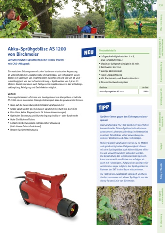 Ein modulares D%u00fcsensystem mit zehn Varianten erlaubt eine Anpassung an unterschiedliche Einsatzbereiche im Gartenbau. Die verf%u00fcgbaren D%u00fcsen decken ein Spektrum von Tropfengr%u00f6%u00dfen zwischen 30 und 500 %u00b5m ab und %u2013 in Abh%u00e4ngigkeit von der Luftunterst%u00fctzung %u2013 Spr%u00fchweiten von 0,5 bis 13 Metern. Damit sind dann auch fachgerechte Applikationen in der Sch%u00e4dlingsbek%u00e4mpfung, Reinigung und Desinfektion m%u00f6glich. VorteileDank regulierbarem Luftstrom und druckgesteuertem Vorspr%u00fchen erzielt die AS 1200 einen maximalen Fl%u00fcssigkeitstransport %u00fcber die gew%u00fcnschte Distanz.%u2022 Ideal auf die Anwendung abstimmbare Spr%u00fchparameter%u2022 Gro%u00dfe Spr%u00fchweiten bei minimalem Spr%u00fchmittelverlust (0,5 bis 13 m)%u2022 Kein L%u00e4rm, keine Abgase (auch f%u00fcr Indoor-Anwendungen)%u2022 Optimalen Benetzung und Durchdringung des Blatt- oder Buschwerks %u2022 Hohe Zielfl%u00e4cheneffizienz%u2022 Einfache Bedienung dank elektronischer Steuerung (inkl. diverse Schutzfunktionen)%u2022 Bessere Spr%u00fchmittelnutzungAkku-Spr%u00fchgebl%u00e4se AS 1200 von BirchmeierLuftunterst%u00fctzte Spr%u00fchtechnik mit %u00abAccu-Power%u00bb - mit CAS-AkkupackProduktdetails%u2022 Luftgeschwindigkeitsstufen: 1 %u2013 5, plus Turbostufe (max.)%u2022 Maximale Luftgeschwindigkeit: 65 m/s%u2022 Reichweite: bis 13 m%u2022 Geringe L%u00e4rmemission%u2022 Hohe Energieeffizienz%u2022 Mit Flachstrahl- und Rundstrahlaufsatz%u2022 D%u00fcsenschnellwechselsystemGebinde ArtikelAkku-Spr%u00fchgebl%u00e4se AS 1200 5950TIPPSpr%u00fchverfahren gegen den EichenprozessionsspinnerDas Spr%u00fchgebl%u00e4se AS 1200 kombiniert den Vorteil konventioneller D%u00fcsen-Spr%u00fchtechnik mit einem gesteuerten Luftstrom; allerdings im Unterschied zu einem Nebelbl%u00e4ser unter Verwendung modernster Elektronik und Akku-Technologie.Mit der gro%u00dfen Spr%u00fchweite von bis zu 13 Metern und gleichzeitig hohen Zielgenauigkeit k%u00f6nnen mit dem Spr%u00fchgebl%u00e4se auch h%u00f6here B%u00e4ume effektiv und umweltfreundlich behandelt werden.Die Bek%u00e4mpfung des Eichenprozessionsspinners kann nun sowohl vom Boden aus erfolgen als auch mit Hubsteigern. Aufgrund des geringen Gewichts ist es sogar m%u00f6glich, das Spr%u00fchgebl%u00e4se im Rahmen der SKT in den Baum mitzunehmen.AS 1200 ist als Zusatzger%u00e4t konzipiert und funktioniert zusammen mit einem Spr%u00fchger%u00e4t aus der %u00abAccu-Power%u00bb Linie von Birchmeier. NEU131 Pflanzenern%u00e4hrung Pflanzenst%u00e4rkungsmittel und Biostimulanzien Krankheitsbek%u00e4mpfung Sch%u00e4dlingskontrolle Netz- und Haftmittel/ Zusatzstoffe Saatgut Mauerbienen Reiniger/ Zubeh%u00f6r Stallhygiene und Vorratsschutz Keimhemmung