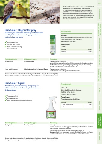 ProduktdetailsWirkstoff200 g/kg Siliciumdioxid/Kieselgur (CAS-Nr. 61790-53-2),DE-0028100-04-0004-18FormulierungAnwendungsfertige Spr%u00fchl%u00f6sungGebinde Artikel1 Liter Spr%u00fchflasche 39425 Liter 3943InsectoSec%u00ae liquidWasserbasierte, anwendungsfertige Fl%u00fcssigl%u00f6sung zur effektiven Bek%u00e4mpfung der Roten Vogelmilbe in kleineren Gefl%u00fcgelbest%u00e4nden%u2714 Anwendungsfertig%u2714 Sehr gute Haftung%u2714 Keine Staubentwicklung bei AusbringungGelistet in der Betriebsmittelliste f%u00fcr die %u00f6kologische Produktion Ausgabe Deutschland (FiBL).Anwendungsbereich Wirkungsstark gegen AnwendungGefl%u00fcgelst%u00e4lle Rote Vogelmilbe 250 ml/m2Vor der Anwendung die L%u00f6sung gut aufsch%u00fctteln, im Abstand von ca. 30 cm gleichm%u00e4%u00dfigen Spr%u00fchbelag erzeugen.Der anfangs feuchte Belag trocknet innerhalb kurzer Zeit ab. (Achtung: Nach jeder Anwendung muss der Spr%u00fchkopf zwingend mit Wasser durchgesp%u00fclt werden, da er sonst verstopft und unbrauchbar wird.)Biozidprodukte vorsichtig verwenden. Vor Gebrauch stets Etikett und Produktinformationen lesen.Gelistet in der Betriebsmittelliste f%u00fcr die %u00f6kologische Produktion Ausgabe Deutschland (FiBL).Biozidprodukte vorsichtig verwenden. Vor Gebrauch stets Etikett und Produktinformationen lesen.ProduktdetailsWirkstoff7,2 % Siliciumdioxid/Kieselgur (CAS-Nr. 61790-53-2),0,5 % Geraniol (CAS-Nr. 106-24-1) BAuA-Reg.Nr. N-115822FormulierungAerosolGebinde Artikel500 ml 3653InsectoSec%u00ae UngeziefersprayAerosolspray zur punktuellen Behandlung von Milbennestern in Gefl%u00fcgelst%u00e4llen und zur Anwendung gegen kriechende Insekten in Haus und Garten.%u2714 Sehr gute Haftung%u2714 Trocknet sehr schnell%u2714 Keine Staubentwicklung bei AusbringungAnwendungsbereich Wirkungsstark gegen AnwendungGefl%u00fcgelst%u00e4lle Rote Vogelmilbe Aufwandmenge: 150 ml/m2Versteckpl%u00e4tze zug%u00e4nglich machen, Milbennester direkt einspr%u00fchen und um das Nest herum einen gleichm%u00e4%u00dfigen Spr%u00fchbelag erzeugen. Der anfangs feuchte Belag trocknet innerhalb kurzer Zeit ab. Haus- und Kleingarten Kriechende Insekten in Haus und Garten Aufwandmenge: 150 ml/m2Versteckpl%u00e4tze und Laufwege der Insekten behandeln137 Pflanzenern%u00e4hrung Pflanzenst%u00e4rkungsmittel und Biostimulanzien Krankheitsbek%u00e4mpfung Sch%u00e4dlingskontrolle Netz- und Haftmittel/ Zusatzstoffe Saatgut Reiniger/ Zubeh%u00f6r Stallhygiene und Vorratsschutz Stallhygiene und Vorratsschutz KeimhemmungDie Produktfamilie InsectoSec%u00ae basiert auf dem Wirkstoff Kieselgur und ist in verschiedenen Formulierungen f%u00fcr individuelle Anwendungen verf%u00fcgbar. Kieselgur ist seit 2018 europaweit als Wirkstoff zur Verwendung in Biozidprodukten der Produktart 18 genehmigt. Die Biofa GmbH ist in Europa als Wirkstofflieferant f%u00fcr Kieselgur in der Liste nach Art. 95 der Verordnung (EU) Nr. 528/2012 %u00fcber Biozidprodukte eingetragen.
