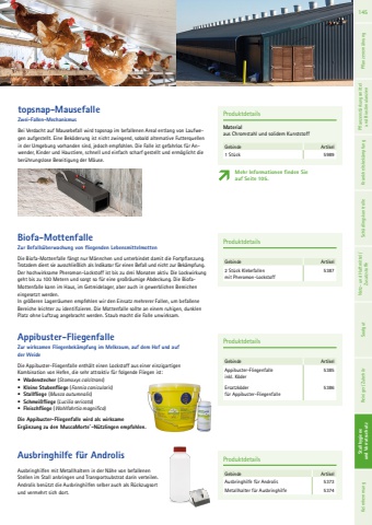 ProduktdetailsGebinde Artikel2 St%u00fcck Klebefallen mit Pheromon-Lockstoff5387Biofa-Mottenfalle Zur Befalls%u00fcberwachung von fliegenden LebensmittelmottenDie Biofa-Mottenfalle f%u00e4ngt nur M%u00e4nnchen und unterbindet damit die Fortpflanzung. Trotzdem dient sie ausschlie%u00dflich als Indikator f%u00fcr einen Befall und nicht zur Bek%u00e4mpfung. Der hochwirksame Pheromon-Lockstoff ist bis zu drei Monaten aktiv. Die Lockwirkung geht bis zu 100 Metern und sorgt so f%u00fcr eine gro%u00dfr%u00e4umige Abdeckung. Die BiofaMottenfalle kann im Haus, im Getreidelager, aber auch in gewerblichen Bereichen eingesetzt werden. In gr%u00f6%u00dferen Lagerr%u00e4umen empfehlen wir den Einsatz mehrerer Fallen, um befallene Bereiche leichter zu identifizieren. Die Mottenfalle sollte an einem ruhigen, dunklen Platz ohne Luftzug angebracht werden. Staub macht die Falle unwirksam.Appibuster-FliegenfalleZur wirksamen Fliegenbek%u00e4mpfung im Melkraum, auf dem Hof und auf der WeideDie Appibuster-Fliegenfalle enth%u00e4lt einen Lockstoff aus einer einzigartigen Kombination von Hefen, die sehr attraktiv f%u00fcr folgende Fliegen ist: %u2022 Wadenstecher (Stomoxys calcitrans)%u2022 Kleine Stubenfliege (Fannia canicularis)%u2022 Stallfliege (Musca autumnalis)%u2022 Schmei%u00dffliege (Lucilia sericata)%u2022 Fleischfliege (Wohlfahrtia magnifica)Die Appibuster-Fliegenfalle wird als wirksame Erg%u00e4nzung zu den MuscaMorte%u00ae-N%u00fctzlingen empfohlen.ProduktdetailsGebinde ArtikelAppibuster-Fliegenfalle inkl. K%u00f6der5385Ersatzk%u00f6der f%u00fcr Appibuster-Fliegenfalle 5386Ausbringhilfe f%u00fcr Androlis Ausbringhilfen mit Metallhaltern in der N%u00e4he von befallenen Stellen im Stall anbringen und Transportsubstrat darin verteilen. Androlis ben%u00fctzt die Ausbringhilfen selber auch als R%u00fcckzugsort und vermehrt sich dort. ProduktdetailsGebinde ArtikelAusbringhilfe f%u00fcr Androlis 5373Metallhalter f%u00fcr Ausbringhilfe 5374ProduktdetailsMaterial aus Chromstahl und solidem KunststoffGebinde Artikel1 St%u00fcck 5989topsnap-MausefalleZwei-Fallen-MechanismusBei Verdacht auf Mausebefall wird topsnap im befallenen Areal entlang von Laufwegen aufgestellt. Eine Bek%u00f6derung ist nicht zwingend, sobald alternative Futterquellen in der Umgebung vorhanden sind, jedoch empfohlen. Die Falle ist gefahrlos f%u00fcr Anwender, Kinder und Haustiere, schnell und einfach scharf gestellt und erm%u00f6glicht die ber%u00fchrungslose Beseitigung der M%u00e4use.Mehr Informationen finden Sie auf Seite 105.145 Pflanzenern%u00e4hrung Pflanzenst%u00e4rkungsmittel und Biostimulanzien Krankheitsbek%u00e4mpfung Sch%u00e4dlingskontrolle Netz- und Haftmittel/ Zusatzstoffe Saatgut Reiniger/ Zubeh%u00f6r Stallhygiene und Vorratsschutz Stallhygiene und Vorratsschutz Keimhemmung