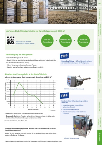 Keimhemmung wird noch eingef%u00fcgtTIPPKontinuierliche Kaltverdunstung mit dem XEDAVAP%u2022 Installation vor den ersten Keimen (pr%u00e4ventiver Einsatz)%u2022 Kontinuierliche Applikation %u2022 Ideal f%u00fcr kleinere L%u00e4ger mit 400 Tonnen KartoffelnUnsere Empfehlung - 12 Tage Wartezeit zwischen der letzten Behandlung und der AuslagerungXEDAVAP (Kaltverdunstung)Mehr Details zu BIOX-M%u00ae finden Sie auf unserer Website. Sie haben keine Anwendungstechnik, m%u00f6chten aber trotzdem BIOX-M%u00ae in Ihrem Kartoffellager einsetzen?Melden Sie sich gerne bei uns %u2013 wir beraten Sie zu den Konditionen und stellen Ihnen geeignete Ger%u00e4te zur Verf%u00fcgung.CEDAX Electrofog (Hei%u00dfvernebelung)Auf einen Blick: Wichtige Schritte zur Kartoffellagerung mit BIOX-M%u00aeVor der AnwendungW%u00e4hrend der AnwendungNach der AnwendungPflanzenschutzmittel vorsichtig verwenden. Vor Verwendung stets Etikett und Produktinformationen lesen.Verfl%u00fcchtigung des Minzgeruchs%u2022 Ursache f%u00fcr Minzgeruch: R-Carvon%u2022 Geruch bleibt nur oberfl%u00e4chlich an der Kartoffelhaut, geht nicht in die Knolle %u00fcber%u2022 15 % Reduktion des Geruchs pro Tag%u2022 H%u00f6here Temperaturen beschleunigen den Prozess%u2022 Waschen und Aufbereitung reduzieren den Geruch um 50 %TIPP%u2022 Geruch: R-Carvon nimmt nach Applikation kontinuierlich ab%u2022 Geschmack: Qualitative Angaben weisen keinen Zusammenhang mit Minze oder %u00e4hnlichen Geschmacksver%u00e4nderungen auf (Essensor, 2019)Abnahme des Carvongehalts in der Kartoffelschalew%u00e4hrend der Lagerung der Sorte Innovator nach Benebelung mit BIOX-M%u00ae2e+72e+72e+71e+71e+71e+78e+66e+64e+62e+60Analysewert an R-Carvon bei m/z 82 Tage nach Applikation0 2 4 6 8 10 12 14 16 18 20InnovatorUniversity of Life Sciences, Posen (Polen), 2023147 Pflanzenern%u00e4hrung Pflanzenst%u00e4rkungsmittel und Biostimulanzien Krankheitsbek%u00e4mpfung Sch%u00e4dlingskontrolle Netz- und Haftmittel/ Zusatzstoffe Saatgut Reiniger/ Zubeh%u00f6r Keimhemmung Keimhemmung Stallhygiene und Vorratsschutz