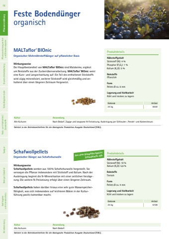 WirkungsweiseDer Hauptbestandteil von MALTaflor%u00aeBIOnic sind Malzkeime, erg%u00e4nzt um Reststoffe aus der Zuckerr%u00fcbenverarbeitung. MALTaflor%u00aeBIOnic weist eine Kurz- und Langzeitwirkung auf: Ein Teil des enthaltenen Stickstoffs wird z%u00fcgig mineralisiert, weiterer Stickstoff wird gleichm%u00e4%u00dfig und anhaltend %u00fcber einen l%u00e4ngeren Zeitraum freigesetzt.ProduktdetailsN%u00e4hrstoffgehaltStickstoff (N): 4 %Phosphor (P2O5): 1 % Kalium (K2O): 5 % RohstoffePflanzlichFormPellets %u00d8 ca. 6 mmLagerung und HaltbarkeitK%u00fchl und trocken zu lagernGebinde Artikel25 kg 6030MALTaflor%u00aeBIOnic Organischer Mehrn%u00e4hrstoffd%u00fcnger auf pflanzlicher BasisKultur AnwendungAlle Kulturen Nach Bedarf. Z%u00fcgige und langsame N-Freisetzung. Ausbringung per Schleuder-, Pendel- und Kastenstreuer.WirkungsweiseSchafwollpellets werden aus 100% Schafschurwolle hergestellt. Sie versorgen die Pflanze insbesondere mit Stickstoff und Kalium. Nach der Ausbringung beginnt die N-Mineralisation mit einer zeitlichen Verz%u00f6gerung. Die weitere N-Freisetzung erfolgt %u00fcber einen l%u00e4ngeren Zeitraum. Schafwollpellets haben dar%u00fcber hinaus eine sehr gute Wasserspeicherf%u00e4higkeit, was sich insbesondere auf leichteren B%u00f6den in der Kulturf%u00fchrung positiv bemerkbar macht.ProduktdetailsN%u00e4hrstoffgehaltStickstoff (N): 10 % Kalium (K2O): 5,6 % RohstoffeTierisch FormPellets %u00d8 ca. 4 mm Lagerung und HaltbarkeitK%u00fchl und trocken zu lagernGebinde Artikel25 kg 6728SchafwollpelletsOrganischer D%u00fcnger aus SchafschurwolleKultur AnwendungAlle Kulturen Nach Bedarf. Feste Bodend%u00fcngerorganischGelistet in der Betriebsmittelliste f%u00fcr die %u00f6kologische Produktion Ausgabe Deutschland (FiBL).Gelistet in der Betriebsmittelliste f%u00fcr die %u00f6kologische Produktion Ausgabe Deutschland (FiBL). Aus dem Biosph%u00e4rengebietSchw%u00e4bische Alb16 Pflanzenern%u00e4hrung Pflanzenst%u00e4rkungsmittel und Biostimulanzien Krankheitsbek%u00e4mpfung Sch%u00e4dlingskontrolle Netz- und Haftmittel/ Zusatzstoffe Saatgut Reiniger/ Zubeh%u00f6r Stallhygiene und Vorratsschutz Keimhemmung Pflanzenern%u00e4hrung