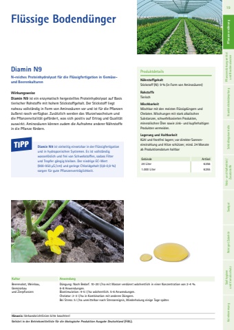 Fl%u00fcssige Bodend%u00fcngerWirkungsweiseDiamin N9 ist ein enzymatisch hergestelltes Proteinhydrolysat auf Basis tierischer Rohstoffe mit hohem Stickstoffgehalt. Der Stickstoff liegt nahezu vollst%u00e4ndig in Form von Aminos%u00e4uren vor und ist f%u00fcr die Pflanzen %u00e4u%u00dferst rasch verf%u00fcgbar. Zus%u00e4tzlich werden das Wurzelwachstum und die Pflanzenvitalit%u00e4t gef%u00f6rdert, was sich positiv auf Ertrag und Qualit%u00e4t auswirkt. Aminos%u00e4uren k%u00f6nnen zudem die Aufnahme anderer N%u00e4hrstoffe in die Pflanze f%u00f6rdern.ProduktdetailsN%u00e4hrstoffgehaltStickstoff (N): 9 % (in Form von Aminos%u00e4uren)RohstoffeTierisch MischbarkeitMischbar mit den meisten Fl%u00fcssigd%u00fcngern und Chelaten. Mischungen mit stark alkalischen Substanzen, schwefelbasierten Produkten, mineralischen %u00d6len sowie zink- und kupferhaltigen Produkten vermeiden.Lagerung und HaltbarkeitK%u00fchl und frostfrei lagern; vor direkter Sonneneinstrahlung und Hitze sch%u00fctzen; mind. 24 Monate ab Produktionsdatum haltbarGebinde Artikel20 Liter 62561.000 Liter 6255Diamin N9N-reiches Proteinhydrolysat f%u00fcr die Fl%u00fcssigfertigation in Gem%u00fcseund BeerenkulturenTIPP Diamin N9 ist vielseitig einsetzbar in der Fl%u00fcssigfertigation und in hydroponischen Systemen. Es ist vollst%u00e4ndig wasserl%u00f6slich und frei von Schwebstoffen, sodass Filter und Tropfer g%u00e4ngig bleiben. Der niedrige EC-Wert (900-950 %u00b5S / cm) und geringe Chloridgehalt (0,8-0,9 %) sorgen f%u00fcr gute Pflanzenvertr%u00e4glichkeit. Kultur AnwendungBeerenobst, Weinbau, Gem%u00fcsebau und ZierpflanzenD%u00fcngung: Nach Bedarf. 10-20 l/ha mit Wasser verd%u00fcnnt w%u00f6chentlich in einer Konzentration von 2-4 %. 6-8 Anwendungen.Biostimulation: 4-5 l/ha w%u00f6chentlich. 5-6 Anwendungen.Chelator: 2-3 l/ha in Kombination mit anderen D%u00fcngern.Bei Stress: 5 l/ ha unmittelbar nach Stressereignis, Wiederholung einige Tage sp%u00e4ter.Hinweis: Verbandsrichtlinien bitte beachten!Gelistet in der Betriebsmittelliste f%u00fcr die %u00f6kologische Produktion Ausgabe Deutschland (FiBL).19 Pflanzenern%u00e4hrung Pflanzenst%u00e4rkungsmittel und Biostimulanzien Krankheitsbek%u00e4mpfung Sch%u00e4dlingskontrolle Netz- und Haftmittel/ Zusatzstoffe Saatgut Reiniger/ Zubeh%u00f6r Stallhygiene und Vorratsschutz Keimhemmung Pflanzenern%u00e4hrung