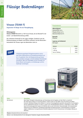 Fl%u00fcssige Bodend%u00fcngerWirkungsweiseVinasse (TEAM F) besteht zu 100 % aus Vinasse, die als Reststoff in der Zucker- und Backhefeherstellung anf%u00e4llt.Der enthaltene Stickstoff ist sehr z%u00fcgig verf%u00fcgbar. Zus%u00e4tzlich wird die Kaliumversorgung von Boden und Pflanze verbessert und die Restzuckerbestandteile der Vinasse regen das Bodenleben stark an.ProduktdetailsN%u00e4hrstoffgehaltStickstoff (N): 4,0 %Phosphat (P2O5): 0,3 % Kaliumoxid (K2O): 6,0 %RohstoffePflanzlichLagerung und HaltbarkeitK%u00fchl lagernGebinde Artikel20 Liter 62301.000 kg 6210lose im Tankzug 6200Vinasse (TEAM F)Organischer N-D%u00fcnger f%u00fcr die Fl%u00fcssigd%u00fcngungKultur AnwendungAlle Kulturen Nach Bedarf. Bez%u00fcglich Aufwandmenge und Anwendung sind die Angaben auf dem Etikett zu beachten! Die Ausbringung erfolgt mit ausreichend Wasser verd%u00fcnnt direkt auf den Boden. Keine Anwendung aufs Blatt. Eventuell vorhandener Belag auf den Bl%u00e4ttern ist nach der Vinasseapplikation gr%u00fcndlich abzuwaschen. Die Vertr%u00e4glichkeit bei empfindlichen Kulturen ist vorher zu testen (z.B. chloridempfindliche Kulturen, Junganlagen im Obst- /Weinbau). Als Anwendungstechnik eignen sich G%u00fcllefass oder je nach technischen Voraussetzungen und entsprechender Vorbereitung auch Feldspritzen und Bew%u00e4sserungsanlagen/ Fertigationssysteme. Unterflurd%u00fcngung ist ebenfalls m%u00f6glich. Hydrokulturen und geschlossene Bew%u00e4sserungssysteme sind f%u00fcr Vinasseeinsatz nicht geeignet (G%u00e4rung im R%u00fccklauf).Hinweis: Verbandsrichtlinien bitte beachten! TIPP In Bew%u00e4sserungsanlagen/ Fertigationssystemen wird je nach Kultur %u00fcblicherweise mit Vinassekonzentrationen von 0,2-2 % gearbeitet. Kann die D%u00fcngerzumischung Vinasse nicht unverd%u00fcnnt ansaugen, wird die ben%u00f6tigte Vinassemenge vorverd%u00fcnnt. Nach der Vinassegabe sind die Leitungen mit klarem Wasser durchzusp%u00fclen, um Verklebungen und Verstopfungen vorzubeugen.Gelistet in der Betriebsmittelliste f%u00fcr die %u00f6kologische Produktion Ausgabe Deutschland (FiBL).20 Pflanzenern%u00e4hrung Pflanzenst%u00e4rkungsmittel und Biostimulanzien Krankheitsbek%u00e4mpfung Sch%u00e4dlingskontrolle Netz- und Haftmittel/ Zusatzstoffe Saatgut Reiniger/ Zubeh%u00f6r Stallhygiene und Vorratsschutz Keimhemmung Pflanzenern%u00e4hrung