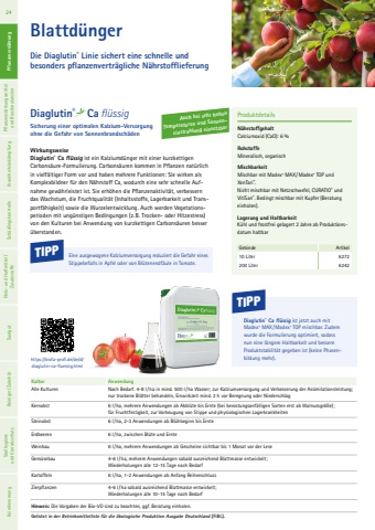 https://biofa-profi.de/de/d/diaglutin-ca-fluessig.htmlBlattd%u00fcngerDie Diaglutin%u00ae Linie sichert eine schnelle und besonders pflanzenvertr%u00e4gliche N%u00e4hrstofflieferungWirkungsweiseDiaglutin%u00ae Ca fl%u00fcssig ist ein Kalziumd%u00fcnger mit einer kurzkettigen Carbons%u00e4ure-Formulierung. Carbons%u00e4uren kommen in Pflanzen nat%u00fcrlich in vielf%u00e4ltiger Form vor und haben mehrere Funktionen: Sie wirken als Komplexbildner f%u00fcr den N%u00e4hrstoff Ca, wodurch eine sehr schnelle Aufnahme gew%u00e4hrleistet ist. Sie erh%u00f6hen die Pflanzenaktivit%u00e4t, verbessern das Wachstum, die Fruchtqualit%u00e4t (Inhaltsstoffe, Lagerbarkeit und Transportf%u00e4higkeit) sowie die Wurzelentwicklung. Auch werden Vegetationsperioden mit ung%u00fcnstigen Bedingungen (z.B. Trocken- oder Hitzestress) von den Kulturen bei Anwendung von kurzkettigen Carbons%u00e4uren besser %u00fcberstanden. ProduktdetailsN%u00e4hrstoffgehaltCalciumoxid (CaO): 6 %RohstoffeMineralisch, organischMischbarkeitMischbar mit Madex%u00ae MAX/Madex%u00ae TOP und XenTari%u00ae.Nicht mischbar mit Netzschwefel, CURATIO%u00ae und VitiSan%u00ae. Bedingt mischbar mit Kupfer (Beratung einholen).Lagerung und HaltbarkeitK%u00fchl und frostfrei gelagert 2 Jahre ab Produktionsdatum haltbarGebinde Artikel10 Liter 6272200 Liter 6242Diaglutin%u00ae Ca fl%u00fcssigSicherung einer optimalen Kalzium-Versorgungohne die Gefahr von Sonnenbrandsch%u00e4denTIPPDiaglutin%u00ae Ca fl%u00fcssig ist jetzt auch mit Madex%u00ae MAX/Madex%u00ae TOP mischbar. Zudem wurde die Formulierung optimiert, sodass nun eine l%u00e4ngere Haltbarkeit und bessere Produktstabilit%u00e4t gegeben ist (keine Phasenbildung mehr).Kultur AnwendungAlle Kulturen Nach Bedarf. 4-8 l/ha in mind. 500 l/ha Wasser; zur Kalziumversorgung und Verbesserung der Assimilationsleistung; nur trockene Bl%u00e4tter behandeln, Einwirkzeit mind. 2 h vor Beregnung oder NiederschlagKernobst 6 l/ha, mehrere Anwendungen ab Abbl%u00fcte bis Ernte (bei berostungsanf%u00e4lligen Sorten erst ab Walnussgr%u00f6%u00dfe);f%u00fcr Fruchtfestigkeit, zur Vorbeugung von Stippe und physiologischen LagerkrankheitenSteinobst 6 l/ha, 2-3 Anwendungen ab Bl%u00fchbeginn bis ErnteErdbeeren 6 l/ha, zwischen Bl%u00fcte und ErnteWeinbau 6 l/ha, mehrere Anwendungen ab Gescheine sichtbar bis 1 Monat vor der LeseGem%u00fcsebau 4-6 l/ha, mehrere Anwendungen sobald ausreichend Blattmasse entwickelt; Wiederholungen alle 12-15 Tage nach BedarfKartoffeln 6 l/ ha, 1-2 Anwendungen ab Anfang ReihenschlussZierpflanzen 4-6 l/ha sobald ausreichend Blattmasse entwickelt; Wiederholungen alle 10-15 Tage nach BedarfHinweis: Die Vorgaben der Bio-VO sind zu beachten, ggf. Beratung einholen.TIPP Eine ausgewogene Kalziumversorgung reduziert die Gefahr eines Stippebefalls in Apfel oder von Bl%u00fctenendf%u00e4ule in Tomate.Gelistet in der Betriebsmittelliste f%u00fcr die %u00f6kologische Produktion Ausgabe Deutschland (FiBL).Auch bei sehr hohen Temperaturen und Sonneneinstrahlung einsetzbar24 Pflanzenern%u00e4hrung Pflanzenst%u00e4rkungsmittel und Biostimulanzien Krankheitsbek%u00e4mpfung Sch%u00e4dlingskontrolle Netz- und Haftmittel/ Zusatzstoffe Saatgut Reiniger/ Zubeh%u00f6r Stallhygiene und Vorratsschutz Keimhemmung Pflanzenern%u00e4hrung