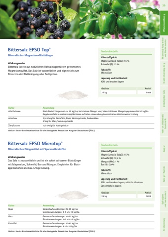 WirkungsweiseBittersalz ist ein aus nat%u00fcrlichen Rohsalzlagerst%u00e4tten gewonnenes Magnesiumsulfat. Das Salz ist wasserl%u00f6slich und eignet sich zum Einsatz in der Blattd%u00fcngung oder Fertigation.Bittersalz EPSO Top%u00aeMineralischer Magnesium-Blattd%u00fcngerProduktdetailsN%u00e4hrstoffgehaltMagnesiumoxid (MgO): 16 %Schwefel (S): 13 %RohstoffeMineralisch Lagerung und HaltbarkeitK%u00fchl und trocken lagern Gebinde Artikel25 kg 5808Kultur AnwendungAlle Kulturen Nach Bedarf. Insgesamt ca. 25 kg / ha, bei starkem Mangel und / oder sichtbaren Mangelsymptomen bis 50 kg /ha. Gegebenenfalls in mehrere Applikationen aufteilen. Anwendungskonzentration %u00fcblicherweise 2-5%ig.Ackerbau 2,5-5%ig f%u00fcr Kartoffeln, Raps, Wintergetreide, Zuckerr%u00fcben5%ig f%u00fcr Mais, SommergetreideZierpflanzen 1,5-3%ig f%u00fcr Nadelgeh%u00f6lzeGelistet in der Betriebsmittelliste f%u00fcr die %u00f6kologische Produktion Ausgabe Deutschland (FiBL).WirkungsweiseDas Salz ist wasserl%u00f6slich und ist ein sofort wirksamer Blattd%u00fcnger mit Magnesium, Schwefel, Bor und Mangan. Empfohlen f%u00fcr Blattapplikationen als max. 5%ige L%u00f6sung.Bittersalz EPSO Microtop%u00aeMineralisches D%u00fcngemittel mit Spurenn%u00e4hrstoffenProduktdetailsN%u00e4hrstoffgehaltMagnesiumoxid (MgO): 15 %Schwefel (S): 12,4 %Mangan (Mn): 1 %Bor (B): 0,9 %RohstoffeMineralisch Lagerung und HaltbarkeitK%u00fchl und trocken lagern, nicht in direktem Sonnenschein lagernGebinde Artikel25 kg 5818Kultur AnwendungRaps Gesamtaufwandmenge: 25-50 kg /haEinzelanwendungen: 3-4 x 5-15 kg / haObst Gesamtaufwandmenge: 10-30 kg / haEinzelanwendungen: 2-3 x 5-15 kg / haKartoffel Gesamtaufwandmenge: 20-40 kg /haEinzelanwendungen: 4 x 5-10 kg /haGelistet in der Betriebsmittelliste f%u00fcr die %u00f6kologische Produktion Ausgabe Deutschland (FiBL).29 Pflanzenern%u00e4hrung Pflanzenst%u00e4rkungsmittel und Biostimulanzien Krankheitsbek%u00e4mpfung Sch%u00e4dlingskontrolle Netz- und Haftmittel/ Zusatzstoffe Saatgut Reiniger/ Zubeh%u00f6r Stallhygiene und Vorratsschutz Keimhemmung Pflanzenern%u00e4hrung