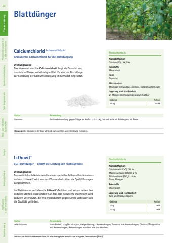 WirkungsweiseDas lebensmittelechte Calciumchlorid liegt als Granulat vor, das sich in Wasser vollst%u00e4ndig aufl%u00f6st. Es wird als Blattd%u00fcnger zur Sicherung der Kalziumversorgung im Kernobst eingesetzt.Calciumchlorid LebensmittelechtGranuliertes Calciumchlorid f%u00fcr die Blattd%u00fcngungProduktdetailsN%u00e4hrstoffgehaltCalcium (Ca): 34,7 %RohstoffeMineralisch FormGranulatMischbarkeitMischbar mit Madex%u00ae, XenTari%u00ae, Netzschwefel StullnLagerung und Haltbarkeit24 Monate ab Produktionsdatum haltbarGebinde Artikel25 kg 6184Kultur AnwendungKernobst Kalziumbehandlung gegen Stippe an Apfel: 1,2-2,2 kg / ha und mKH ab Bl%u00fchbeginn bis Ernte Hinweis: Die Vorgaben der Bio-VO sind zu beachten, ggf. Beratung einholen.Blattd%u00fcngerWirkungsweiseDer nat%u00fcrliche Kalkstein wird in einer speziellen Mikrom%u00fchle feinstvermahlen. Lithovit%u00ae wird von der Pflanze direkt %u00fcber die Spalt%u00f6ffnungen aufgenommen. Im Blattinneren zerfallen die Lithovit%u00ae-Teilchen und setzen neben den anderen Stoffen insbesondere CO2 frei. Das nat%u00fcrliche Wachstum wird dadurch unterst%u00fctzt, die Widerstandskraft gegen Stress verbessert und die Qualit%u00e4t gef%u00f6rdert.ProduktdetailsN%u00e4hrstoffgehaltCalciumoxid (CaO): 35 %Magnesiumoxid (MgO): 2 %Siliziumdioxid (SiO2): 12 %Eisen, ManganRohstoffe MineralischLagerung und Haltbarkeit K%u00fchl und trocken lagernGebinde Artikel1 kg 191510 kg 1916Lithovit%u00aeCO2-Blattd%u00fcnger %u2013 Erh%u00f6ht die Leistung der PhotosyntheseKultur AnwendungAlle Kulturen Nach Bedarf; 1 kg /ha als 0,3-0,5%ige L%u00f6sung; 2 Anwendungen, Tomaten 3-4 Anwendungen, Obstbau/ Ziergeh%u00f6lze 2-3 Anwendungen; Behandlungen maximal alle 3-4 WochenGelistet in der Betriebsmittelliste f%u00fcr die %u00f6kologische Produktion Ausgabe Deutschland (FiBL).30 Pflanzenern%u00e4hrung Pflanzenst%u00e4rkungsmittel und Biostimulanzien Krankheitsbek%u00e4mpfung Sch%u00e4dlingskontrolle Netz- und Haftmittel/ Zusatzstoffe Saatgut Reiniger/ Zubeh%u00f6r Stallhygiene und Vorratsschutz Keimhemmung Pflanzenern%u00e4hrung