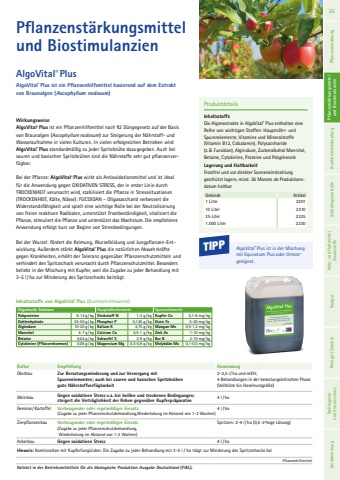 Pflanzenst%u00e4rkungsmittel und BiostimulanzienProduktdetailsInhaltsstoffeDie Algenextrakte in AlgoVital%u00ae Plus enthalten eine Reihe von wichtigen Stoffen: Hauptn%u00e4hr- und Spurenelemente, Vitamine und Mineralstoffe (Vitamin B12, Cobalamin), Polysaccharide (z.B. Fucoidan), Algins%u00e4ure, Zuckeralkohol Mannitol, Betaine, Cytokinine, Proteine und Polyphenole Lagerung und HaltbarkeitFrostfrei und vor direkter Sonneneinstrahlung gesch%u00fctzt lagern, mind. 36 Monate ab Produktionsdatum haltbarGebinde Artikel1 Liter 220110 Liter 221025 Liter 22251.000 Liter 2230AlgoVital%u00ae PlusAlgoVital%u00ae Plus ist ein Pflanzenhilfsmittel basierend auf dem Extrakt von Braunalgen (Ascophyllum nodosum)Kultur Empfehlung AnwendungObstbau Zur Berostungsminderung und zur Versorgung mit Spurenelementen; auch bei sauren und basischen Spritzbr%u00fchen gute N%u00e4hrstoffverf%u00fcgbarkeit2-2,5 l/ ha und mKH; 4 Behandlungen in der berostungskritischen Phase (Vollbl%u00fcte bis Haselnussgr%u00f6%u00dfe)Weinbau Gegen oxidativen Stress v.a. bei hei%u00dfen und trockenen Bedingungen; steigert die Vertr%u00e4glichkeit der Reben gegen%u00fcber Kupferpr%u00e4paraten 4 l/haGem%u00fcse /Kartoffel Vorbeugender oder regelm%u00e4%u00dfiger Einsatz (Zugabe zu jeder Pflanzenschutzbehandlung,Wiederholung im Abstand von 1-2 Wochen)4 l/haZierpflanzenbau Vorbeugender oder regelm%u00e4%u00dfiger Einsatz (Zugabe zu jeder Pflanzenschutzbehandlung, Wiederholung im Abstand von 1-2 Wochen)Spritzen: 2-4 l/ ha (0,5-2%ige L%u00f6sung)Ackerbau Gegen oxidativen Stress 4 l/haHinweis: Kombination mit Kupferfungiziden: Die Zugabe zu jeder Behandlung mit 3-5 l / ha tr%u00e4gt zur Minderung des Spritzschocks beiPflanzenhilfsmittelInhaltsstoffe von AlgoVital%u00ae Plus (Durchschnittswerte)Organische Substanz Hauptn%u00e4hrelemente SpurenelementeRohproteine 6-14 g / kg Stickstoff N 1-2 g / kg Kupfer Cu 0,1-6 mg / kgKohlenhydrate 35-50 g / kg Phosphor P 0,145 g / kg Eisen Fe 5-20 mg / kgAlgins%u00e4ure 10-20 g / kg Kalium K 4,75 g / kg Mangan Mn 0,5-1,2 mg / kgMannitol 4-7 g / kg Calcium Ca 0,5-1 g / kg Zink Zn 1-10 mg / kgBetaine 0,04 g / kg Schwefel S 3-9 g / kg Bor B 2-10 mg / kgCytokinine (Pflanzenhormon) 0,06 g / kg Magnesium Mg 0,5-0,9 g / kg Molybd%u00e4n Mo 0,1-0,5 mg / kgGelistet in der Betriebsmittelliste f%u00fcr die %u00f6kologische Produktion Ausgabe Deutschland (FiBL).WirkungsweiseAlgoVital%u00ae Plus ist ein Pflanzenhilfsmittel nach %u00a72 D%u00fcngegesetz auf der Basis von Braunalgen (Ascophyllum nodosum) zur Steigerung der N%u00e4hrstoff- und Wasseraufnahme in vielen Kulturen. In vielen erfolgreichen Betrieben wird AlgoVital%u00ae Plus standardm%u00e4%u00dfig zu jeder Spritzbr%u00fche dazugegeben. Auch bei sauren und basischen Spritzbr%u00fchen sind die N%u00e4hrstoffe sehr gut pflanzenverf%u00fcgbar. Bei der Pflanze: AlgoVital%u00ae Plus wirkt als Antioxidationsmittel und ist ideal f%u00fcr die Anwendung gegen OXIDATIVEN STRESS, der in erster Linie durch TROCKENHEIT verursacht wird, stabilisiert die Pflanze in Stresssituationen (TROCKENHEIT, K%u00e4lte, N%u00e4sse): FUCOIDAN %u2013 Oligosaccharid verbessert die Widerstandsf%u00e4higkeit und spielt eine wichtige Rolle bei der Neutralisierung von freien reaktiven Radikalen, unterst%u00fctzt Frostbest%u00e4ndigkeit, vitalisiert die Pflanze, stimuliert die Pflanze und unterst%u00fctzt das Wachstum. Die empfohlene Anwendung erfolgt kurz vor Beginn von Stressbedingungen. Bei der Wurzel: f%u00f6rdert die Keimung, Wurzelbildung und Jungpflanzen-Entwicklung. Au%u00dferdem st%u00e4rkt AlgoVital%u00ae Plus die nat%u00fcrlichen Abwehrkr%u00e4fte gegen Krankheiten, erh%u00f6ht der Toleranz gegen%u00fcber Pflanzenschutzmitteln und verhindert den Spritzschock verursacht durch Pflanzenschutzmittel. Besonders beliebt in der Mischung mit Kupfer, weil die Zugabe zu jeder Behandlung mit 3-5 l/ ha zur Minderung des Spritzschocks beitr%u00e4gt.TIPP AlgoVital%u00ae Plus ist in der Mischung mit Equisetum Plus oder Urteco%u00aegeeignet.35 Pflanzenern%u00e4hrung Pflanzenst%u00e4rkung Krankheitsbek%u00e4mpfung Sch%u00e4dlingskontrolle Netz- und Haftmittel/ Zusatzstoffe Saatgut Reiniger/ Zubeh%u00f6r Pflanzenst%u00e4rkungsmittel und Biostimulanzien Stallhygiene und Vorratsschutz Keimhemmung