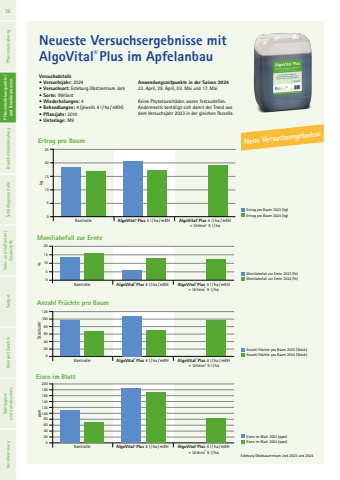 Neueste Versuchsergebnisse mit AlgoVital%u00ae Plus im Apfelanbau Versuchsdetails%u2022 Versuchsjahr: 2024%u2022 Versuchsort: Esteburg Obstzentrum Jork%u2022 Sorte: Wellant%u2022 Wiederholungen: 4%u2022 Behandlungen: 4 (jeweils 4 l/ha /mKH)%u2022 Pflanzjahr: 2010%u2022 Unterlage: M9Anwendungszeitpunkte in der Saison 202423. April, 29. April, 03. Mai und 17. MaiKeine Phytotoxsch%u00e4den waren festzustellen.Andererseits best%u00e4tigt sich damit der Trend aus dem Versuchsjahr 2023 in der gleichen Parzelle.Esteburg Obstbauzentrum Jork 2023 und 2024Ertrag pro BaumKontrolle AlgoVital%u00ae Plus 4 l/ ha /mKH AlgoVital%u00ae Plus 4 l/ ha /mKH+ Urteco%u00ae 5 l/ ha2520151050kgAnzahl Fr%u00fcchte pro Baum120100806040200St%u00fcckzahlKontrolle AlgoVital%u00ae Plus 4 l/ ha /mKH AlgoVital%u00ae Plus 4 l/ ha /mKH+ Urteco%u00ae 5 l/ haEisen im BlattKontrolle AlgoVital%u00ae Plus 4 l/ ha /mKH AlgoVital%u00ae Plus 4 l/ ha /mKH+ Urteco%u00ae 5 l/ ha200180160140120100806040200ppm Ertrag pro Baum 2023 (kg) Ertrag pro Baum 2024 (kg) Anzahl Fr%u00fcchte pro Baum 2023 (St%u00fcck) Anzahl Fr%u00fcchte pro Baum 2024 (St%u00fcck) Eisen im Blatt 2023 (ppm) Eisen im Blatt 2024 (ppm) Moniliabefall zur ErnteKontrolle AlgoVital%u00ae Plus 4 l/ ha /mKH AlgoVital%u00ae Plus 4 l/ ha /mKH+ Urteco%u00ae 5 l/ ha20151050% Moniliabefall zur Ernte 2023 (%) Moniliabefall zur Ernte 2024 (%) Neue Versuchsergebnisse36 Pflanzenern%u00e4hrung Pflanzenst%u00e4rkung Krankheitsbek%u00e4mpfung Sch%u00e4dlingskontrolle Netz- und Haftmittel/ Zusatzstoffe Saatgut Reiniger/ Zubeh%u00f6r Pflanzenst%u00e4rkungsmittel und Biostimulanzien Stallhygiene und Vorratsschutz Keimhemmung