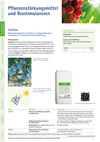 WirkungsweiseCutiSan f%u00f6rdert durch die Ausbildung eines feinen Spritzbelages die Elastizit%u00e4t der Epidermiszellen und bietet gleichzeitig der Frucht in der Entwicklungsphase einen Schutz vor nichtparasit%u00e4ren Beeintr%u00e4chtigungen. Der Einfluss von abiotischem Stress wie N%u00e4sse, K%u00e4lte, starke Sonneneinstrahlung wird gemindert. W%u00e4hrend der Fruchtausbildungsphase reduziert CutiSan die Bildung von Fruchtberostung und verbessert so die Qualit%u00e4t der Frucht. ProduktdetailsInhaltsstoffeEnth%u00e4lt hochreines, feinvermahlenes KaolinLagerung und HaltbarkeitTrocken lagern, mind. 36 Monate ab Produktionsdatum haltbarGebinde Artikel25 kg 5816CutiSanPflanzenst%u00e4rkungsmittel zum Schutz vor nichtparasit%u00e4ren Beeintr%u00e4chtigungen wie Sonnenbrand und FruchtberostungKultur Empfehlung AnwendungKernobst St%u00e4rkung bei Anf%u00e4lligkeit gegen%u00fcber Fruchtberostung1 kg / ha und mKH in 500-1.000 l Wasser/ ha (bei Feinspr%u00fchen in 200 l Wasser/ ha) und mKH; die Aufwandmenge ist auf 2 kg / ha und mKH zu erh%u00f6hen, wenn die Bedingungen f%u00fcr Berostung besonders g%u00fcnstig sind (K%u00e4lte, N%u00e4sse, starke Temperaturschwankungen)1. Anwendung zur abgehenden Bl%u00fcteNichtparasit%u00e4re Beeintr%u00e4chtigung wie Sonnenbrand5-7 kg / ha und mKH; Spritzbelag im Abstand von sieben Tagen, bzw. nach Abwaschen des Belages durch Regen erneuernBirnblattsauger (aus eigener Erfahrung, keine zugelassene Indikation) 10 kg / ha und mKHWeinbau Nichtparasit%u00e4re Beeintr%u00e4chtigung wie Sonnenbrand8-15 kg / ha CutiSan in 400-500 l Wasser/ haab Erbsengr%u00f6%u00dfe bis WeichwerdenHinweis: Optimale Wirkung wird nur bei vollst%u00e4ndiger Benetzung der Pflanze erreicht, Zugabe von Zentero%u00ae SPR 0,2 % empfohlen.gemeldet als Pflanzenst%u00e4rkungsmittel gem%u00e4%u00df %u00a7 45 PflschGCutiSan-Belag nach Antrocknung (appliziert wurde ab Erbsengr%u00f6%u00dfe)Der feine CutiSan-Belag auf den Beeren reflektiert einen Gro%u00dfteil der eintreffenden UV- und Infrarotstrahlung Gelistet in der Betriebsmittelliste f%u00fcr die %u00f6kologische Produktion Ausgabe Deutschland (FiBL).https://biofa-profi.de/de/c/cutisan.htmlPflanzenst%u00e4rkungsmittel und Biostimulanzien40 Pflanzenern%u00e4hrung Pflanzenst%u00e4rkung Krankheitsbek%u00e4mpfung Sch%u00e4dlingskontrolle Netz- und Haftmittel/ Zusatzstoffe Saatgut Reiniger/ Zubeh%u00f6r Pflanzenst%u00e4rkungsmittel und Biostimulanzien Stallhygiene und Vorratsschutz Keimhemmung