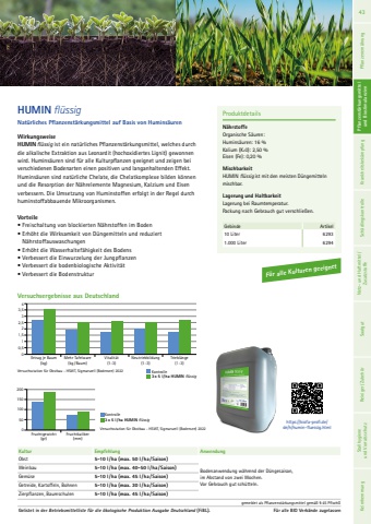 F%u00fcr alle BIO Verb%u00e4nde zugelassenWirkungsweiseHUMINfl%u00fcssig ist ein nat%u00fcrliches Pflanzenst%u00e4rkungsmittel, welches durch die alkalische Extraktion aus Leonardit (hochoxidiertes Lignit) gewonnen wird. Humins%u00e4uren sind f%u00fcr alle Kulturpflanzen geeignet und zeigen bei verschiedenen Bodenarten einen positiven und langanhaltenden Effekt. Humins%u00e4uren sind nat%u00fcrliche Chelate, die Chelatkomplexe bilden k%u00f6nnen und die Resorption der N%u00e4hrelemente Magnesium, Kalzium und Eisen verbessern. Die Umsetzung von Huminstoffen erfolgt in der Regel durch huminstoffabbauende Mikroorganismen. Vorteile%u2022 Freischaltung von blockierten N%u00e4hrstoffen im Boden%u2022 Erh%u00f6ht die Wirksamkeit von D%u00fcngemitteln und reduziert N%u00e4hrstoffauswaschungen%u2022 Erh%u00f6ht die Wasserhaltef%u00e4higkeit des Bodens%u2022 Verbessert die Einwurzelung der Jungpflanzen%u2022 Verbessert die bodenbiologische Aktivit%u00e4t %u2022 Verbessert die BodenstrukturProduktdetailsN%u00e4hrstoffeOrganische S%u00e4uren:Humins%u00e4uren: 16 %Kalium (K20): 2,50 %Eisen (Fe): 0,20 %MischbarkeitHUMIN fl%u00fcssig ist mit den meisten D%u00fcngemitteln mischbar.Lagerung und HaltbarkeitLagerung bei Raumtemperatur.Packung nach Gebrauch gut verschlie%u00dfen.Gebinde Artikel10 Liter 62931.000 Liter 6294HUMIN fl%u00fcssigNat%u00fcrliches Pflanzenst%u00e4rkungsmittel auf Basis von Humins%u00e4urenKultur Empfehlung AnwendungObst 5-10 l/ha (max. 50 l/ha /Saison)Bodenanwendung w%u00e4hrend der D%u00fcngesaison, im Abstand von zwei Wochen. Vor Gebrauch gut sch%u00fctteln.Weinbau 5-10 l/ha (max. 40-50 l/ha /Saison)Gem%u00fcse 5-10 l/ha (max. 45 l/ha /Saison)Getreide, Kartoffeln, Bohnen 5-10 l/ha (max. 30 l/ha /Saison)Zierpflanzen, Baumschulen 5-10 l/ha (max. 45 l/ha /Saison)gemeldet als Pflanzenst%u00e4rkungsmittel gem%u00e4%u00df %u00a7 45 PflschGGelistet in der Betriebsmittelliste f%u00fcr die %u00f6kologische Produktion Ausgabe Deutschland (FiBL).https://biofa-profi.de/de/h/humin-fluessig.htmlVersuchsergebnisse aus Deutschland0011000,5501,51502,53,5422003Ertrag je Baum(kg)Mehr Tafelware(kg / Baum)Vitalit%u00e4t(1-3)Neutriebbildung(1-3)Triebl%u00e4nge(1-3)Fruchtgewicht(gr)Fruchtkaliber(mm)Versuchsstation f%u00fcr Obstbau - HSWT, Sigmarszell (Bodensee) 2022Versuchsstation f%u00fcr Obstbau - HSWT, Sigmarszell (Bodensee) 2022Kontrolle 3x 5 l/ha HUMIN fl%u00fcssigKontrolle 3x 5 l/ha HUMIN fl%u00fcssigF%u00fcr alle Kulturen geeignet43 Pflanzenern%u00e4hrung Pflanzenst%u00e4rkung Krankheitsbek%u00e4mpfung Sch%u00e4dlingskontrolle Netz- und Haftmittel/ Zusatzstoffe Saatgut Reiniger/ Zubeh%u00f6r Pflanzenst%u00e4rkungsmittel und Biostimulanzien Stallhygiene und Vorratsschutz Keimhemmung