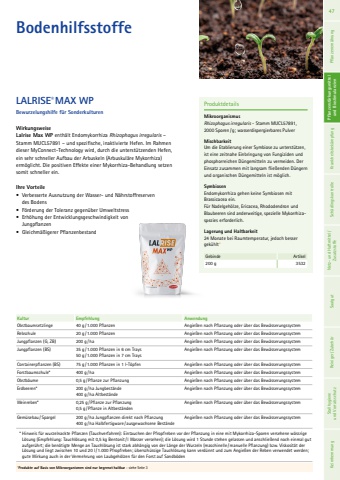 BodenhilfsstoffeLALRISE%u00aeMAX WP Bewurzelungshilfe f%u00fcr SonderkulturenWirkungsweiseLalrise Max WP enth%u00e4lt Endomykorrhiza Rhizophagus irregularis %u2013 Stamm MUCL57891 %u2013 und spezifische, inaktivierte Hefen. Im Rahmen dieser MyConnect-Technology wird, durch die unterst%u00fctzenden Hefen, ein sehr schneller Aufbau der Arbuskeln (Arbuskul%u00e4re Mykorrhiza) erm%u00f6glicht. Die positiven Effekte einer Mykorrhiza-Behandlung setzen somit schneller ein. Ihre Vorteile%u2022 Verbesserte Ausnutzung der Wasser- und N%u00e4hrstoffreserven des Bodens%u2022 F%u00f6rderung der Toleranz gegen%u00fcber Umweltstress%u2022 Erh%u00f6hung der Entwicklungsgeschwindigkeit von Jungpflanzen%u2022 Gleichm%u00e4%u00dfigerer Pflanzenbestand ProduktdetailsMikroorganismusRhizophagus irregularis - Stamm MUCL57891, 2000 Sporen/ g; wasserdispergierbares PulverMischbarkeitUm die Etablierung einer Symbiose zu unterst%u00fctzen, ist eine zeitnahe Einbringung von Fungiziden und phosphorreichen D%u00fcngemitteln zu vermeiden. Der Einsatz zusammen mit langsam flie%u00dfenden D%u00fcngern und organischen D%u00fcngemitteln ist m%u00f6glich.SymbiosenEndomykorrhiza gehen keine Symbiosen mit Brassicacea ein.F%u00fcr Nadelgeh%u00f6lze, Ericacea, Rhododendron und Blaubeeren sind anderweitige, spezielle Mykorrhizaspezies erforderlich.Lagerung und Haltbarkeit24 Monate bei Raumtemperatur, jedoch besser gek%u00fchlt*Gebinde Artikel200 g 3532Kultur Empfehlung AnwendungObstbaumsetzlinge 40 g /1.000 Pflanzen Angie%u00dfen nach Pflanzung oder %u00fcber das Bew%u00e4sserungssystemRebschule 20 g /1.000 Pflanzen Angie%u00dfen nach Pflanzung oder %u00fcber das Bew%u00e4sserungssystemJungpflanzen (G, ZB) 200 g /ha Angie%u00dfen nach Pflanzung oder %u00fcber das Bew%u00e4sserungssystemJungpflanzen (BS) 35 g /1.000 Pflanzen in 6 cm Trays50 g /1.000 Pflanzen in 7 cm TraysAngie%u00dfen nach Pflanzung oder %u00fcber das Bew%u00e4sserungssystemContainerpflanzen (BS) 75 g /1.000 Pflanzen in 1 l-T%u00f6pfen Angie%u00dfen nach Pflanzung oder %u00fcber das Bew%u00e4sserungssystemForstbaumschule* 400 g /ha Angie%u00dfen nach Pflanzung oder %u00fcber das Bew%u00e4sserungssystemObstb%u00e4ume 0,5 g / Pflanze zur Pflanzung Angie%u00dfen nach Pflanzung oder %u00fcber das Bew%u00e4sserungssystemErdbeeren* 200 g /ha Jungbest%u00e4nde400 g /ha Altbest%u00e4ndeAngie%u00dfen nach Pflanzung oder %u00fcber das Bew%u00e4sserungssystemWeinreben* 0,25 g / Pflanze zur Pflanzung0,5 g / Pflanze in Altbest%u00e4ndenAngie%u00dfen nach Pflanzung oder %u00fcber das Bew%u00e4sserungssystemGem%u00fcsebau / Spargel 200 g /ha Jungpflanzen direkt nach Pflanzung400 g /ha Halbfertigware / ausgewachsene Best%u00e4ndeAngie%u00dfen nach Pflanzung oder %u00fcber das Bew%u00e4sserungssystem * Hinweis f%u00fcr wurzelnackte Pflanzen (Tauchverfahren): Eintauchen der Pfropfreben vor der Pflanzung in eine mit Mykorrhiza-Sporen versehene w%u00e4ssrige L%u00f6sung (Empfehlung: Tauchl%u00f6sung mit 0,5 kg Bentonit/l Wasser versehen); die L%u00f6sung wird 1 Stunde stehen gelassen und anschlie%u00dfend noch einmal gut aufger%u00fchrt; die ben%u00f6tigte Menge an Tauchl%u00f6sung ist stark abh%u00e4ngig von der L%u00e4nge der Wurzeln (maschinelle /manuelle Pflanzung) bzw. Viskosit%u00e4t der L%u00f6sung und liegt zwischen 10 und 20 l/ 1.000 Pfropfreben; %u00fcbersch%u00fcssige Tauchl%u00f6sung kann verd%u00fcnnt und zum Angie%u00dfen der Reben verwendet werden; gute Wirkung auch in der Vermehrung von Laubgeh%u00f6lzen f%u00fcr den Forst auf Sandb%u00f6den*Produkte auf Basis von Mikroorganismen sind nur begrenzt haltbar - siehe Seite 347 Pflanzenern%u00e4hrung Pflanzenst%u00e4rkung Krankheitsbek%u00e4mpfung Sch%u00e4dlingskontrolle Netz- und Haftmittel/ Zusatzstoffe Saatgut Reiniger/ Zubeh%u00f6r Pflanzenst%u00e4rkungsmittel und Biostimulanzien Stallhygiene und Vorratsschutz Keimhemmung