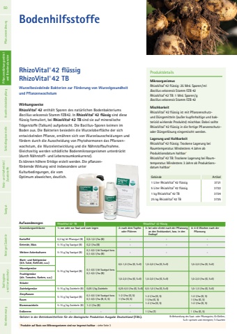 WirkungsweiseRhizoVital%u00ae 42 enth%u00e4lt Sporen des nat%u00fcrlichen Bodenbakteriums Bacillus velezensis Stamm FZB42. In RhizoVital%u00ae42 fl%u00fcssig sind diese fl%u00fcssig formuliert, bei RhizoVital%u00ae42 TB sind sie auf mineralische Tr%u00e4gerstoffe (Talkum) aufgebracht. Die Bacillus-Sporen keimen im Boden aus. Die Bakterien besiedeln die Wurzeloberfl%u00e4che der sich entwickelnden Pflanze, ern%u00e4hren sich von Wurzelausscheidungen und f%u00f6rdern durch die Ausscheidung von Phytohormonen das Pflanzenwachstum, die Wurzelentwicklung und die N%u00e4hrstoffaufnahme. Gleichzeitig werden sch%u00e4dliche Bodenmikroorganismen unterdr%u00fcckt (durch N%u00e4hrstoff- und Lebensraumkonkurrenz). Es k%u00f6nnen h%u00f6here Ertr%u00e4ge erzielt werden. Die pflanzenf%u00f6rdernde Wirkung wird insbesondere unter Kulturbedingungen, die vom Optimum abweichen, deutlich.ProduktdetailsMikroorganismusRhizoVital%u00ae 42 fl%u00fcssig: 25 Mrd. Sporen/mlBacillus velezensis Stamm FZB 42RhizoVital%u00ae 42 TB: 1 Mrd. Sporen/gBacillus velezensis Stamm FZB 42MischbarkeitRhizoVital%u00ae 42 fl%u00fcssig ist mit Pflanzenschutzund D%u00fcngemitteln (au%u00dfer kupferhaltige und bakterizid wirkende Produkte) mischbar. Dabei sollte RhizoVital%u00ae 42 fl%u00fcssig in die fertige Pflanzenschutzoder D%u00fcngerl%u00f6sung eingemischt werden.Lagerung und HaltbarkeitRhizoVital%u00ae 42 fl%u00fcssig: Trockene Lagerung bei Raumtemperatur. Mindestens 4 Jahre ab Produktionsdatum haltbar*RhizoVital%u00ae 42 TB: Trockene Lagerung bei Raumtemperatur. Mindestens 3 Jahre ab Produktionsdatum haltbar*Gebinde Artikel1 Liter RhizoVital%u00ae 42 fl%u00fcssig 37215 Liter RhizoVital%u00ae 42 fl%u00fcssig 37221 kg RhizoVital%u00ae 42 TB 372425 kg RhizoVital%u00ae 42 TB 3725RhizoVital%u00ae42 fl%u00fcssigRhizoVital%u00ae42 TBWurzelbesiedelnde Bakterien zur F%u00f6rderung von Wurzelgesundheit und PflanzenwachstumRhizoVital 42%u00ae TB RhizoVital%u00ae 42 fl%u00fcssigAnwendungszeitr%u00e4ume 1: vor oder zur Saat und zum Legen 2: nach dem Topfen oder Pikieren3: bei oder direkt nach der Pflanzung an den Endstandort, bzw. in den Endtopf4: 4-6 Wochen nach der PflanzungKartoffel 0,2 kg / dt Pflanzgut (B) 0,5-1,0 l/ha (B) - - -Getreide, Mais 5-15 g / kg Saatgut (B) 0,2 l/ ha (B) - - -Weitere Ackerkulturen 5-15 g / kg Saatgut (B) 0,1-0,5 l/ dt Saatgut bzw. 0,1-0,5 l/ ha (B) - - -Blatt- und Kohlgem%u00fcse (d.h. Salat, Kohlrabi, u.a.)5-15 g / kg Saatgut (B) 0,1-0,5 l/ dt Saatgut bzw. 0,1-0,5 l/ ha (B)0,5-1,0 l/ ha (G, S+E) 1,0-2,0 l/ ha (G, S+E) 1,0-2,0 l/ ha (G, S+E)Wurzelgem%u00fcseFruchtgem%u00fcse (d.h. Tomaten, Gurken, u.a.) 1,0-2,0 l/ ha (G, S+E) 1,0-2,0 l/ ha (G, S+E) 1,0-2,0 l/ ha (G, S+E)Kr%u00e4uterZwiebelgem%u00fcse 5-15 g / kg Zwiebeln (B) 0,05 l/ kg Zwiebeln 0,25-0,5 l/ ha (G, S+E) 0,5-1,0 l/ ha (G, S+E) 1,0-1,5 l/ ha (G, S+E)Zierpflanzen5-15 g / kg Saatgut (B) 0,1-0,5 l/ dt Saatgut bzw. 0,1-0,5 l/ha (B, G, S)1-2 l/ ha (G, S)1 l/ ha (G, S)1-2 l/ ha (G, S)1 l/ ha (G, S)1-2 l/ ha (G, S)1-2 l/ha (G, S)1 l/ ha (G, S)1-2 l/ha (G, S)RasenBlumenzwiebeln 5-15 g / kg Zwiebeln (B) 1-2 l/ha (B) -Erdbeeren - - - 1 l/ha (T) 1 l/ha (G, S)AufwandmengenB=Behandlung des Saat- oder Pflanzgutes; G=Gie%u00dfen; S+E= spritzen und einregnen; T=TauchenGelistet in der Betriebsmittelliste f%u00fcr die %u00f6kologische Produktion Ausgabe Deutschland (FiBL).*Produkte auf Basis von Mikroorganismen sind nur begrenzt haltbar - siehe Seite 3Bodenhilfsstoffe50 Pflanzenern%u00e4hrung Pflanzenst%u00e4rkung Krankheitsbek%u00e4mpfung Sch%u00e4dlingskontrolle Netz- und Haftmittel/ Zusatzstoffe Saatgut Reiniger/ Zubeh%u00f6r Pflanzenst%u00e4rkungsmittel und Biostimulanzien Stallhygiene und Vorratsschutz Keimhemmung