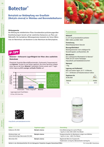 Botector%u00aeBotrytizid zur Bek%u00e4mpfung von Grauf%u00e4ule (Botrytis cinerea) in Weinbau und BeerenobstkulturenWirkungsweiseDie Wirkung des hefe%u00e4hnlichen Pilzes Aureobasidium pullulans gegen%u00fcber Krankheitserregern beruht auf der nat%u00fcrlichen Konkurrenz um Platz und N%u00e4hrstoffe. Die hochaktiven Mikroorganismen besiedeln die feinen Mikrorisse der Beerenhaut und blockieren so das Wachstum des Botrytispilzes.ProduktdetailsWirkstoff5 x 109 cfu/g Aureobasidium pullulansDSM 14940 und DSM 14941FormulierungWasserdispergierbares GranulatBienengef%u00e4hrlichkeit N%u00fctzlingsschonend: nicht sch%u00e4digend f%u00fcr Nutzarthropoden und Raubmilben; B4MischbarkeitEine umfangreiche Mischtabelle f%u00fcr Botector%u00ae finden Sie auf unserer Homepage: https://biofa-profi.de/de/b/botector.htmlWartezeit 1 TagLagerung und HaltbarkeitK%u00fchl und trocken lagern; 20 %u00b0C: 18 Monate; 8 %u00b0C : 30 Monate ab Produktionsdatum haltbarZugelassen bis30.06.2028Gebinde Artikel1 kg 5413Kultur Zugelassen gegen AnwendungErdbeeren (FL /GH) Botrytis cinerea Erste Bl%u00fctenanlage bis zweite Pfl%u00fccke1 kg / ha in mind. 500-2.000 l/ ha WasserHimbeerartiges und Johannisbeerartiges Beerenobst (FL /GH) Botrytis cinerea Knospenschwellen bis Basisbeeren neigen zum Abfallen 1 kg / ha in max. 1.000 l/ ha WasserWeinreben (FL) Botrytis cinerea Abgehende Bl%u00fcte bis Traubenreife Traubenzone: 0,4 kg / ha; Basisaufwand: 0,25 kg / haGelistet in der Betriebsmittelliste f%u00fcr die %u00f6kologische Produktion Ausgabe Deutschland (FiBL). FL=Freiland, GH=Gew%u00e4chshaushttps://biofa-profi.de/de/b/botector.htmlIP-TIPPBotector%u00ae%u2013 Verbesserte Lagerf%u00e4higkeit der Ware ohne zus%u00e4tzliche R%u00fcckst%u00e4ndeChemische Fungizide (Boscalid/Pyraclostrobin, Fenhexamid, Fenpyrazamine) und Botector%u00ae wurden 6 x pro Saison appliziert. Die letzte Spritzung erfolgte einen Tag vor der Ernte. Botector%u00ae behandelte Fr%u00fcchte wiesen nach 7 Tagen k%u00fchler Lagerung 25% weniger verfaulte Fr%u00fcchte auf.Lagerungsversuch Fruchtf%u00e4ulenAT, Rust, 2018, Sorte AsiaEinzig Botector%u00ae darf im Gegensatz zu den genannten chemischen Fungiziden in der Praxis bis 1 Tag vor der Ernte eingesetzt werden und erzeugt zudem keine zus%u00e4tzlichen R%u00fcckst%u00e4nde.50403020100Befallsh%u00e4ufigkeit 7 Tage Lagerung (%)Unbehandelt Chem. Fungizide Botector%u00aeabb- 25%56 Pflanzenern%u00e4hrung Pflanzenst%u00e4rkungsmittel und Biostimulanzien Krankheitsbek%u00e4mpfung Sch%u00e4dlingskontrolle Netz- und Haftmittel/ Zusatzstoffe Saatgut Reiniger/ Zubeh%u00f6r Krankheitsbek%u00e4mpfung Stallhygiene und Vorratsschutz Keimhemmung