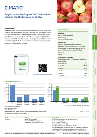 CURATIO%u00aeFungizid zur Bek%u00e4mpfung von Schorf und anderen pilzlichen Krankheitserregern im ObstbauWirkungsweiseCURATIO%u00ae ist ein nicht r%u00fcckstandsrelevantes Kontaktfungizid mit starker kurativer und vorbeugender Wirkung. CURATIO%u00ae wird vorwiegend kurativ als Stopp-Behandlung in das Keimungsfenster der Ascosporenphase der Schorfinfektion eingesetzt. Die kurative Anwendung ist bis 300%u00b0h (Gradstunden; Basis 0%u00b0C) nach Regenbeginn und beginnender Infektion auf das nasse Blatt m%u00f6glich. Auch der kurative Einsatz in der Konidienphase ist bei langen Blattnasszeiten sinnvoll.ProduktdetailsWirkstoff380 g/l CalciumpolysulfidFormulierungDispergierbares KonzentratMischbarkeitCURATIO%u00ae sollte solo ausgebracht werden. Wegen des hohen pH-Werts (pH ca. 11) ist eine Tankmischung mit weiteren Produkten nicht zu empfehlen (ausgenommen AlgoVital%u00ae Plus).Wartezeit 7 TageLagerung und HaltbarkeitFrostfrei lagern, mind. 24 Monate ab Produktionsdatum haltbarZugelassen bis31.01.2028Gebinde Artikel20 Liter 4055200 Liter 40501.000 Liter 4052Gelistet in der Betriebsmittelliste f%u00fcr die %u00f6kologische Produktion Ausgabe Deutschland (FiBL). FL=Freiland, GH=Gew%u00e4chshaus, mKH=Meter Kronenh%u00f6hehttps://biofa-profi.de/de/c/curatio.htmlKultur Gegen AnwendungKernobst Schorf (Venturia spp.)Birnenschorf (Venturia pyrina)Lagerschorf (Venturia inaequalis)Bei Infektionsgefahr bzw. ab WarndiensthinweisIn der Anwendung: 17In der Kultur bzw. je Jahr: 17Abstand: mindestens 3 Tag(e)max. Aufwandmenge pro Behandlung: 18 l/hamax. Aufwandmenge f%u00fcr die Kultur bzw. das Kalenderjahr: 306 l/hamax. laubwandfl%u00e4chenbezogene Aufwandmenge: 10 l/10.000 m%u00b2 Laubwandfl%u00e4che in 389-833 l/10.000 m%u00b2 Laubwandfl%u00e4che WasserKOB Bavendorf 20230105152520UK CURATIO%u00ae a.i. Dodin a.i. Dithianon164,7 4,7 3,821,74,5 4,86,8Blattschorfbefall in %2 Boniturtermine 21.06.2023 12.07.2023Apfelschorfversuch 20230105152520UK Dithianon (protektiv)Dithianon (kurativ)CURATIO%u00ae(kurativ)Dodin (kurativ)Boniturtermin am 15.08.2023 Sorte: Golden DeliciousBehandlung: KurativBehandlungstermine: in jeder Variante 5 Behandlungen von BBCH 56 bis BBCH 59Vor- und Nachbehandlungen: Betriebs%u00fcblich235,33,36,7Fruchtschorfbefall in %859 Pflanzenern%u00e4hrung Pflanzenst%u00e4rkungsmittel und Biostimulanzien Krankheitsbek%u00e4mpfung Sch%u00e4dlingskontrolle Netz- und Haftmittel/ Zusatzstoffe Saatgut Reiniger/ Zubeh%u00f6r Krankheitsbek%u00e4mpfung Stallhygiene und Vorratsschutz Keimhemmung
