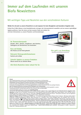 6 Immer auf dem Laufenden mit unseren Biofa NewsletternMit wichtigen Tipps und Neuheiten aus den verschiedenen KulturenIhr ThemenschwerpunktOb Obst-, Wein-, Gem%u00fcse-, Zierpflanzen- oder Ackerbau, Stallhygiene und Vorratsschutz, Sie entscheiden!Kurz und b%u00fcndigAlle Themen auf den Punkt gebrachtRelevante HintergrundinformationenFachlich voll im BildeSchnelle Updates zu unseren ProduktenWarum warten bis zur n%u00e4chsten MesseAlle Biofa-Neuheiten immer aktuell f%u00fcr SieMelden Sie sich jetzt zu unseren Newslettern an und verpassen Sie keine Neuigkeiten und besonderen Angebote mehr. Einfach Ihre E-Mail-Adresse in das Anmeldeformular eintragen, den Interessensbereich ausw%u00e4hlen und von unseren regelm%u00e4%u00dfigen Updates profitieren. Seien Sie immer auf dem neuesten Stand und erhalten Sie als Erstes Informationen zu unseren Produkten und Veranstaltungen. https://biofa-profi.de/de/biofa-newsletter.htmlJetzt anmelden!Hier geht%u00b4s zur AnmeldungHinweisDiese Produktinformationen ersetzen nicht die Gebrauchsanleitung und gelten nur f%u00fcr Deutschland. Pflanzenschutzmittel vorsichtig verwenden. Vor Verwendung stets Etikett und Produktinformationen lesen.Biozidprodukte vorsichtig verwenden. Vor Gebrauch stets Etikett und Produktinformationen lesen.Ab dem 01.01.2025 sind Abgabebeschr%u00e4nkungen f%u00fcr Biozidprodukte gem. ChemBiozidDV zu beachten. Die aktuellen Anwendungsvorschriften und die Zulassungsmodalit%u00e4ten entnehmen Sie bitte dem Etikett des jeweiligen Produktes.Nach Drucklegung aufkommende, zulassungsrechtliche %u00c4nderungen sind zu ber%u00fccksichtigen. Bitte max. Anwendungszahl pro Saison der entsprechenden Mittel beachten. Bei Kombinationen, Mischungstabelle in unserem Produktkatalog beachten. Die Biofa GmbH %u00fcbernimmt keine Haftung im Falle von Spritzsch%u00e4den.Sicherheitsdatenbl%u00e4tter finden Sie im Internet unter www.biofa-profi.de.Seit dem 26.11.2015 d%u00fcrfen Pflanzenschutzmittel, die f%u00fcr berufliche Anwender zugelassen sind, nur gegen Vorlage des neuen Sachkundenachweises abgegeben werden.Bildrechte: Die Bilder sind mit freundlicher Unterst%u00fctzung der Firmen Andermatt Group AG/ Schweiz, ABiTEP GmbH, Biobest/ Belgien, Jansen LVG K%u00f6ln-Auweiler, NATURIM Afleveborn, Netafim, Oro Agri Europe S. A., Silicya Roth, SUMITOMO CHEMICALS AgroSolutions Division %u2013 International und Suterra, sowie der Speditionen Dachser, DPD, f%u00fcr diese Ver%u00f6ffentlichung zur Verf%u00fcgung gestellt worden. %u00a9 AdobeStock / %u00a9 shutterstockRegistrierte Marken: EPSO Top%u00ae / EPSO Microtop%u00ae, KALISOP%u00ae gran %u2013 K+S Minerals and Agriculture GmbH %u2022 Blossom Protect%u2122, Botector%u00ae %u2013SAN Agrow Holding GmbH %u2022 BioAgenasol%u00ae %u2013AGRANA Beteiligungs-AG %u2022 BIOX-M%u00ae %u2013XEDA International S.A .%u2022 CheckMate%u00ae Puffer%u00ae LB/ EA, CheckMate%u00ae Puffer%u00ae CM, CheckMate%u00ae Puffer%u00ae Leaf Multi %u2013Suterra LLC %u2022 Cuproxat%u00ae %u2013 NUFARM GMBH & CO KG %u2022 Cuprozin%u00ae progress, Funguran%u00ae progress %u2013 Cosaco GmbH %u2022 EIFELGOLD%u00ae Urgesteinsmehl %u2013 Rheinische ProvinzialBasalt- und Lavawerke GmbH & Co. oHG %u2022 FZB24%u00ae WG, RhizoVital%u00ae42 fl%u00fcssig / TB%u2013ABiTEP GmbH %u2022 Lithovit%u00ae %u2013Tribodyn AG %u2022 Micula%u00ae %u2013 Scotts Celaflor GmbH %u2022 NeemAzal%u00ae-T/S, Trifolio%u00ae S-forte, Tripheron%u00ae-Falle %u2013Trifolio-M GmbH %u2022 Piretro Verde%u00ae %u2013Copyr S.p.A. Compagnia del Piretro %u2022 Neudosan%u00ae Neu, Promanal%u00ae HP, Sluxx%u00ae HP, Spruzit%u00ae NEU%u2013W. Neudorff GmbH KG %u2022 Capex%u00ae 2, Madex%u00ae MAX / Madex%u00ae TOP / Madex%u00ae Primo, T-Gro %u2013 Andermatt Group AG %u2022 TRICO%u00ae %u2013 Kwizda Agro GmbH %u2022 PREV-AM%u00ae, PREV-GOLD%u00ae%u2013 Oro Agri Europe S. A. %u2022 Gnatrol%u00ae SC, XenTari%u00ae %u2013 Valent BioSciences LLC %u2022 LALSTIM%u00ae OSMO, LALSTOP%u00ae, CONTANS WG, PRESTOP%u00ae (WP)%u2013Danstar Ferment AG %u2022 Isomate%u00ae OFM rosso FLEX%u2013Shin-Etsu Chemical Co., Ltd. %u2022 ATTRACAP%u00ae %u2013BIOCARE GmbH %u2022 EDASIL%u00ae Naturbentonit%u2013agrimont GmbH %u2022 MALTaflor%u00ae BIOnic%u2013MALTaflor Europa GmbH %u2022 ProFital%u00aefluid%u2013 Certis Belchim B.V. %u2022 PROMOS%u00ae %u2013Arvalus GmbH %u2022 MENNO Florades%u00ae %u2013 MENNO CHEMIE-VERTRIEBS GmbH %u2022 NATURALIS%u00ae %u2013CBC (Europe) S.r.l. %u2022 FytoSol%u00ae %u2013 FytoFend S.A. %u2022 Sumifly%u00ae OD %u2013 Sumitomo Chemical Co. LTD.