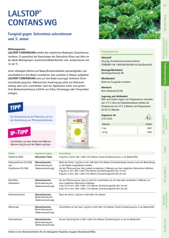 LALSTOP%u00aeCONTANSWGFungizid gegen Sclerotinia sclerotiorum und S. minorWirkungsweiseLALSTOP%u00aeCONTANS WG enth%u00e4lt den nat%u00fcrlichen Bodenpilz Coniothyrium minitans . Er parasitiert die Dauerk%u00f6rper des Sklerotinia-Pilzes und t%u00f6tet sie ab. Ideale Bedingungen: ausreichend Bodenfeuchte und -temperaturen von 12-20 %u00b0C.Unter st%u00e4ndigem R%u00fchren auf Boden/Ernter%u00fcckst%u00e4nde spritzen/gie%u00dfen und anschlie%u00dfend in den Boden einarbeiten. Das zun%u00e4chst in Wasser aufgel%u00f6ste LALSTOP%u00aeCONTANS WG wird auf den Boden (und ggf. befallene Ernter%u00fcckst%u00e4nde) gespritzt. W%u00e4hrend der Ausbringung sollte das R%u00fchrwerk st%u00e4ndig aktiv sein, unmittelbar nach der Applikation sollte eine gr%u00fcndliche Bodeneinarbeitung mithilfe von Fr%u00e4se, Kreiselegge oder Feingrubber erfolgen.ProduktdetailsWirkstoff50 g/kg Coniothyrium minitans Stamm CON/M/91-08 1.000.000.000.000 cfu/kg (Granulat)Bienengef%u00e4hrlichkeit N%u00fctzlingsschonend; B3MischbarkeitNicht mit Fungiziden mischenWartezeit Keine Wartezeit (F/N)Lagerung und Haltbarkeit K%u00fchl und trocken lagern, bei Temperaturen unterhalb von 4%u00b0C 2 Jahre ab Produktionsdatum haltbar, bei Temperaturen bis 15%u00b0C 3 Wochen, bei Temperaturen bis 20%u00b0C 2 WochenZugelassen bis31.07.2033Gebinde Artikel4 kg 584120 kg 5483Kultur Zugelassen gegen AnwendungSalatarten (GH) Sklerotinia-F%u00e4ule 4 kg /ha in mind. 500-1.000 l/ha Wasser, flache Einarbeitung (ca. 5 cm Bodentiefe)Gem%u00fcsekulturen (FL /GH)undZierpflanzen (FL /GH)Sklerotiniaarten(Verminderung der Bodenverseuchung)Nach der Ernte: 2 kg / ha in min. 200-500 l/ha Wasser, Ernter%u00fcckst%u00e4nde m%u00fcssen nach der Behandlung in den Boden eingearbeitet werden Vor der Pflanzung bzw. Saat, jedoch mindestens 2 Monate vor einer m%u00f6glichen Sklerotinia-Infektion: 4 kg /ha in min. 200-1.000 l/ha Wasser, Einarbeitungstiefe (bis 10 cm) 8 kg /ha in min. 200-1.000 l/ha Wasser, Einarbeitungstiefe (bis 20 cm) Kartoffeln,AckerbohneSklerotiniaarten(Verminderung der Bodenverseuchung)Vor der Pflanzung bzw. Saat, je nach Art unmittelbar vor der Saat oder mindestens 2 Monate vor einer m%u00f6glichen Sklerotinia-Infektion:4 kg / ha in min. 200-1.000 l / ha Wasser, Einarbeitungstiefe (bis 10 cm)8 kg / ha in min. 200-1.000 l / ha Wasser, Einarbeitungstiefe (bis 20 cm)Ackerbaukulturen Sklerotiniaarten(Verminderung der Bodenverseuchung)Nach der Ernte: 2 kg /ha in 200-500 l/ ha Wasser Winterraps Sklerotiniaarten(Verminderung der Bodenverseuchung)Unmittelbar vor der Saat 2 kg /ha in 200-500 l/ha Wasser, flache Einarbeitung (ca. 5 cm Bodentiefe) Sonnenblumen Sklerotiniaarten(Verminderung der Bodenverseuchung)Vor der Saat 8 kg / ha in 200-1.000 l/ha Wasser, Einarbeitung bis zu 20 cm BodentiefeTIPPZur Anwendung vor der Pflanzung und vor der Einarbeitung von Pflanzenr%u00fcckst%u00e4nden.IP-TIPPUnmittelbar vor dem Fr%u00e4sen der M%u00f6hrend%u00e4mme 6 kg / ha auf den Boden spritzen.Gelistet in der Betriebsmittelliste f%u00fcr die %u00f6kologische Produktion Ausgabe Deutschland (FiBL).61 Pflanzenern%u00e4hrung Pflanzenst%u00e4rkungsmittel und Biostimulanzien Krankheitsbek%u00e4mpfung Sch%u00e4dlingskontrolle Netz- und Haftmittel/ Zusatzstoffe Saatgut Reiniger/ Zubeh%u00f6r Krankheitsbek%u00e4mpfung Stallhygiene und Vorratsschutz Keimhemmung