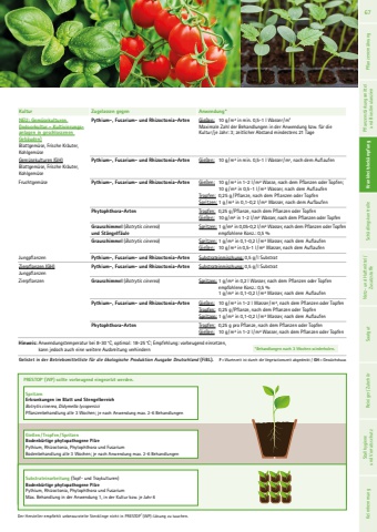 Kultur Zugelassen gegen Anwendung*NEU: Gem%u00fcsekulturen (Indoorkultur - Kultivierungsanlagen in geschlossenen Geb%u00e4uden)Blattgem%u00fcse, Frische Kr%u00e4uter,Kohlgem%u00fcsePythium-, Fusarium- und Rhizoctonia-Arten Gie%u00dfen: 10 g/m%u00b2 in min. 0,5-1 l Wasser/m2Maximale Zahl der Behandlungen in der Anwendung bzw. f%u00fcr die Kultur/je Jahr: 3; zeitlicher Abstand mindestens 21 Tage Gem%u00fcsekulturen (GH)Blattgem%u00fcse, Frische Kr%u00e4uter,Kohlgem%u00fcsePythium-, Fusarium- und Rhizoctonia-Arten Gie%u00dfen: 10 g/m%u00b2 in min. 0,5-1 l Wasser/m2, nach dem AuflaufenFruchtgem%u00fcse Pythium-, Fusarium- und Rhizoctonia-Arten Gie%u00dfen: 10 g/m%u00b2 in 1-2 l/m%u00b2 Wasse, nach dem Pflanzen oder Topfen; 10 g /m%u00b2 in 0,5-1 l/m%u00b2 Wasser, nach dem AuflaufenTropfen: 0,25 g / Pflanze, nach dem Pflanzen oder Topfen Spritzen: 1 g /m%u00b2 in 0,1-0,2 l/m%u00b2 Wasser, nach dem AuflaufenPhytophthora-Arten Tropfen: 0,25 g/Pflanze, nach dem Pflanzen oder TopfenGie%u00dfen: 10 g/m%u00b2 in 1-2 l/m%u00b2 Wasser, nach dem Pflanzen oder TopfenGrauschimmel (Botrytis cinerea) und St%u00e4ngelf%u00e4uleSpritzen: 1 g/m%u00b2 in 0,05-0,2 l/m%u00b2 Wasser, nach dem Pflanzen oder Topfenempfohlene Konz.: 0,5 %Grauschimmel (Botrytis cinerea) Spritzen: 1 g/m%u00b2 in 0,1-0,2 l/m%u00b2 Wasser, nach dem AuflaufenGie%u00dfen: 10 g/m%u00b2 in 0,5-1 l/m%u00b2 Wasser, nach dem AuflaufenJungpflanzen Pythium-, Fusarium- und Rhizoctonia-Arten Substrateinmischung: 0,5 g/l SubstratZierpflanzen (GH)JungpflanzenPythium-, Fusarium- und Rhizoctonia-Arten Substrateinmischung: 0,5 g/l SubstratZierpflanzen Grauschimmel (Botrytis cinerea) Spritzen: 1 g/m%u00b2 in 0,2 l Wasser, nach dem Pflanzen oder Topfenempfohlene Konz.: 0,5 % 1 g/m%u00b2 in 0,1-0,2 l/m%u00b2 Wasser, nach dem AuflaufenPythium-, Fusarium- und Rhizoctonia-Arten Gie%u00dfen: 10 g/m%u00b2 in 1-2 l Wasser/m%u00b2, nach dem Pflanzen oder TopfenTropfen: 0,25 g/Pflanze, nach dem Pflanzen oder Topfen Spritzen: 1 g/m%u00b2 in 0,1-0,2 l/m%u00b2 Wasser, nach dem AuflaufenPhytophthora-Arten Tropfen: 0,25 g pro Pflanze, nach dem Pflanzen oder TopfenGie%u00dfen: 10 g/m%u00b2 in 1-2 l/m%u00b2 Wasser, nach dem Pflanzen oder TopfenHinweis: Anwendungstemperatur bei 8-30%u00b0C, optimal: 18-25%u00b0C; Empfehlung: vorbeugend einsetzen, kann jedoch auch eine weitere Ausbreitung verhindern *Behandlungen nach 3 Wochen wiederholen.PRESTOP%u00ae (WP) sollte vorbeugend eingesetzt werden.Der Hersteller empfiehlt unbewurztelte Stecklinge nicht in PRESTOP%u00ae (WP)-L%u00f6sung zu tauchen.SpritzenErkrankungen im Blatt und Stengelbereich Botrytis cinerea, Didymella lycopersiciPflanzenbehandlung alle 3 Wochen; je nach Anwendung max. 2-6 BehandlungenGie%u00dfen/ Tropfen/SpritzenBodenb%u00fcrtige phytopathogene Pilze Pythium, Rhizoctonia, Phytophthora und FusariumBodenbehandlung alle 3 Wochen; je nach Anwendung max. 2-6 BehandlungenSubstrateinarbeitung (Topf- und Traykulturen)Bodenb%u00fcrtige phytopathogene PilzePythium, Rhizoctonia, Phytophthora und Fusarium Max. Behandlung in der Anwendung 1, in der Kultur bzw. je Jahr 6Gelistet in der Betriebsmittelliste f%u00fcr die %u00f6kologische Produktion Ausgabe Deutschland (FiBL). F=Wartezeit ist durch die Vegetationszeit abgedeckt / GH=Gew%u00e4chshaus67 Pflanzenern%u00e4hrung Pflanzenst%u00e4rkungsmittel und Biostimulanzien Krankheitsbek%u00e4mpfung Sch%u00e4dlingskontrolle Netz- und Haftmittel/ Zusatzstoffe Saatgut Reiniger/ Zubeh%u00f6r Krankheitsbek%u00e4mpfung Stallhygiene und Vorratsschutz Keimhemmung