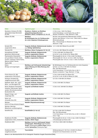 Kultur Zugelassen gegen AnwendungBrombeere, Himbeere (FL /GH), Johannisbeerartiges Beerenobst (FL /GH)Brombeere, Himbeere nur Blattl%u00e4useJohannisbeerartiges Beerenost Blattl%u00e4use, Kleiner Frostspanner (L1 bis L2)3 l/ ha in max. 1.000 l/ ha WasserIn der Anwendung: 2; in der Kultur bzw. je Jahr: 2Abstand: mindestens 7 Tage; Wartezeit 3 TageErdbeere (FL /GH) Blattl%u00e4use Bei Befallsbeginn bzw. bei Sichtbarwerden der ersten Symptome /SchadorganismenAb Erste, noch geschlossene Bl%u00fctenknospen sichtbar Spritzen oder Spr%u00fchen: 3 l/ha in min. 1.000-2.000 l/ha Wasser (Reihenbehandlung)Max. 3 Anwendungen im Abstand von mind. 7 TagenWartezeit: 3 Tage Kernobst (FL); ausgenommen BirneSaugende, Bei%u00dfende, Blattminierende Insekten, u. a. Mehlige Apfelblattlaus1,5 l in 300-500 lWasser/ ha und mKHSteinobst (FL) Blattl%u00e4use, Kleiner Frostspanner (L1 bis L2) 1,5 l in min. 500 lWasser/ha und mKH Arzneipflanzen (FL /GH)(getrocknet, Blattnutzung)Saugende, Bei%u00dfende, Blattminierende Insekten; ausgenommen Wanzen 3 l/ ha in 500-600 l/ha Wasser (FL)0,3 ml/m%u00b2 in min. 50-60 ml/m%u00b2 Wasser (GH)Flaschenk%u00fcrbis, Riesenk%u00fcrbis (mit genie%u00dfbarer Schale), Gurke, Zucchini, Aubergine, Garten-K%u00fcrbis, Moschus-K%u00fcrbis, Tomate, Paprika (GH)Saugende, Bei%u00dfende, Blattminierende Insekten; ausgenommen Wanzen Pflanzengr%u00f6%u00dfe bis 50 cm: 2 l/ha in 600 l/ ha Wasser Pflanzengr%u00f6%u00dfe 50-125 cm: 2,5 l/ ha in 800 l/ ha Wasser Pflanzengr%u00f6%u00dfe %u00fcber 125 cm: 3 l/ ha in 1.000 l/ha Wasser Erbsen (Ertrags-und Junganlagen)Blattl%u00e4use und Freifressende Schmetterlingsraupen (Nutzung mit H%u00fclse /Nutzung ohne H%u00fclse) im FLBei Befallsbeginn bzw. bei Sichtbarwerden der ersten SymptomeSpritzen: 2,5 l/ha in 400-600 l/ ha WasserMax. Zahl BehandlungenIn der Anwendung: 3; in der Kultur bzw. je Jahr: 3Abstand: mindestens 7 Tage; Wartezeit: 14 TageFrische Kr%u00e4uter (FL, GH); ausgenommen SchnittlauchSaugende, Bei%u00dfende, Blattminierende Insekten; ausgenommen Wanzen 3 l/ ha in 500 bis 800 l/ha Wasser (FL)0,3 ml/m%u00b2 in min. 50-80 ml Wasser/m%u00b2 (GH) Gr%u00fcnkohl, Chinakohl (FL)Jungpflanzenanzucht (GH)Saugende, Bei%u00dfende, Blattminierende Insekten; ausgenommen Wanzen 2,5 l/ha in 300-600 l/ ha WasserKopfkohle: Wei%u00df-, Rot-, Spitz-, Rosen- und Wirsingkohl (FL) Saugende, Bei%u00dfende, Blattminierende Insekten; ausgenommen Wanzen 3 l/ha in 500-800 l/ ha WasserPorree, Knoblauch, Perlzwiebel,Schalotte, Silberzwiebel, Speisezwiebel, Winterheckenzwiebel/ Bundzwiebeln (FL)Saugende und Bei%u00dfende Insekten 3 l/ha in min. 300-600 l/ha WasserSpargel: Ertrags- und Junganlagen (FL)Saugende und Bei%u00dfende Insekten 3 l/ha in 300-600 l/ ha WasserSpinat und verwandte Arten (FL)Saugende, Bei%u00dfende, Blattminierende Insekten; ausgenommen Wanzen 3 l/ha in 600-800 l/ ha WasserWeinbau (nicht im Ertrag stehende Anlagen)Maik%u00e4fer (Populationsminderung) 3 l/ha in 400-800 l/ ha WasserWeinbau: Weinrebe (Rebschulen und Mutterg%u00e4rten)Reblaus 3 l/ha in 400-800 l/ ha WasserKartoffeln (FL) Kartoffelk%u00e4fer (L1 bis L2) 2,5 l/ha in 300-700 l/ ha Wasser Max. Zahl BehandlungenIn der Anwendung: 2; In der Kultur bzw. je Jahr: 2; Abstand: mind. 7 TageZierpflanzen (FL /GH); ausgenommen: Birne, Zierkoniferen Saugende, Bei%u00dfende, Blattminierende Insekten, Wei%u00dfe FliegenPflanzengr%u00f6%u00dfe bis 50 cm: 3 l/ ha in max. 2.000 l/ ha Wasser4 Anwendungen pro Kultur/Jahr Zierpflanzen (GH) Blattl%u00e4use (Aphidina), Freifressende Schmetterlingsraupen, Minierfliegen (Agromyzidae), Thripse (Thysanoptera), Wei%u00dfe Fliegen (Aleyrodoidea), Spinnmilben (Tetranychus spp.) 3,75 l/ha in 500-2.000 l/ ha WasserZierpflanzen (GH); JungpflanzenanzuchtTrauerm%u00fccken Gie%u00dfanwendung mit 150 l/ha in 30.000 l/ha Wasser (entspricht einer Konzentration von 0,5 %)Gelistet in der Betriebsmittelliste f%u00fcr die %u00f6kologische Produktion Ausgabe Deutschland (FiBL).91 Pflanzenern%u00e4hrung Pflanzenst%u00e4rkungsmittel und Biostimulanzien Krankheitsbek%u00e4mpfung Sch%u00e4dlingskontrolle Netz- und Haftmittel/ Zusatzstoffe Saatgut Reiniger/ Zubeh%u00f6r Sch%u00e4dlingskontrolle Stallhygiene und Vorratsschutz Keimhemmung