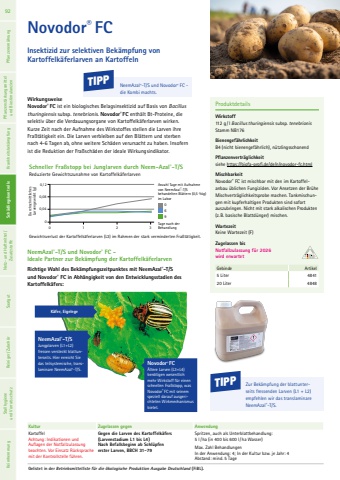 Novodor%u00ae FCInsektizid zur selektiven Bek%u00e4mpfung von Kartoffelk%u00e4ferlarven an KartoffelnWirkungsweiseNovodor%u00ae FC ist ein biologisches Belagsinsektizid auf Basis von Bacillus thuringiensis subsp. tenebrionis. Novodor%u00ae FC enth%u00e4lt Bt-Proteine, die selektiv %u00fcber die Verdauungsorgane von Kartoffelk%u00e4ferlarven wirken. Kurze Zeit nach der Aufnahme des Wirkstoffes stellen die Larven ihre Fra%u00dft%u00e4tigkeit ein. Die Larven verbleiben auf den Bl%u00e4ttern und sterben nach 4-6 Tagen ab, ohne weitere Sch%u00e4den verursacht zu haben. Insofern ist die Reduktion der Fra%u00dfsch%u00e4den der ideale Wirkungsindikator.ProduktdetailsWirkstoff112 g /l Bacillus thuringiensis subsp. tenebrionisStamm NB176Bienengef%u00e4hrlichkeit B4 (nicht bienengef%u00e4hrlich), n%u00fctzlingsschonendPflanzenvertr%u00e4glichkeitsiehe https://biofa-profi.de/de/n/novodor-fc.htmlMischbarkeitNovodor%u00ae FC ist mischbar mit den im Kartoffelanbau %u00fcblichen Fungiziden. Vor Ansetzen der Br%u00fche Mischvertr%u00e4glichkeitsprobe machen. Tankmischungen mit kupferhaltigen Produkten sind sofort auszubringen. Nicht mit stark alkalischen Produkten (z.B. basische Blattd%u00fcnger) mischen.Wartezeit Keine Wartezeit (F)Zugelassen bisNotfallzulassung f%u00fcr 2026 wird erwartetGebinde Artikel5 Liter 484120 Liter 4848Kultur Zugelassen gegen AnwendungKartoffelAchtung: Indikationen und Auflagen der Notfallzulassung beachten. Vor Einsatz R%u00fccksprache mit der Kontrollstelle f%u00fchren.Gegen die Larven des Kartoffelk%u00e4fers (Larvenstadium L1 bis L4) Nach Befallsbeginn ab Schl%u00fcpfen erster Larven, BBCH 31-79Spritzen, auch als Unterblattbehandlung:5 l/ha (in 400 bis 600 l/ ha Wasser)Max. Zahl BehandlungenIn der Anwendung: 4; In der Kultur bzw. je Jahr: 4Abstand: mind. 5 TageTIPP Zur Bek%u00e4mpfung der blattunterseits fressenden Larven (L1 + L2) empfehlen wir das translaminare NeemAzal%u00ae-T/S.Schneller Fra%u00dfstopp bei Junglarven durch Neem-Azal%u00ae-T/SReduzierte Gewichtszunahme von Kartoffelk%u00e4ferlarvenGewichtsverlust der Kartoffelk%u00e4ferlarven (L3) im Rahmen der stark verminderten Fra%u00dft%u00e4tigkeit.00,080,040 1 30,12Durchschnittliches Larvengewicht (g)Tage nach der BehandlungAnzahl Tage mit Aufnahme von NeemAzal%u00ae-T/S behandelten Bl%u00e4ttern (0,5 %ig) im Labor 0 6 92NeemAzal%u00ae-T/SJungplarven (L1+L2) fressen versteckt blattunterseits. Hier erreicht Sie das teilsystemische, translaminare NeemAzal%u00ae-T/S.Novodor%u00ae FC%u00c4ltere Larven (L3+L4) ben%u00f6tigen wesentlich mehr Wirkstoff f%u00fcr einen schnellen Fra%u00dfstopp, was Novodor%u00ae FC mit seinem speziell darauf ausgerichteten Wirkmechanismus bietet.NeemAzal%u00ae-T/S und Novodor%u00ae FC - Ideale Partner zur Bek%u00e4mpfung der Kartoffelk%u00e4ferlarvenRichtige Wahl des Bek%u00e4mpfungszeitpunktes mit NeemAzal%u00ae-T/S und Novodor%u00ae FC in Abh%u00e4ngigkeit von den Entwicklungsstadien des Kartoffelk%u00e4fers:TIPP NeemAzal%u00ae-T/S und Novodor%u00ae FC - die Kombi machts.Gelistet in der Betriebsmittelliste f%u00fcr die %u00f6kologische Produktion Ausgabe Deutschland (FiBL). K%u00e4fer, Eigelege92 Pflanzenern%u00e4hrung Pflanzenst%u00e4rkungsmittel und Biostimulanzien Krankheitsbek%u00e4mpfung Sch%u00e4dlingskontrolle Netz- und Haftmittel/ Zusatzstoffe Saatgut Reiniger/ Zubeh%u00f6r Sch%u00e4dlingskontrolle Stallhygiene und Vorratsschutz Keimhemmung