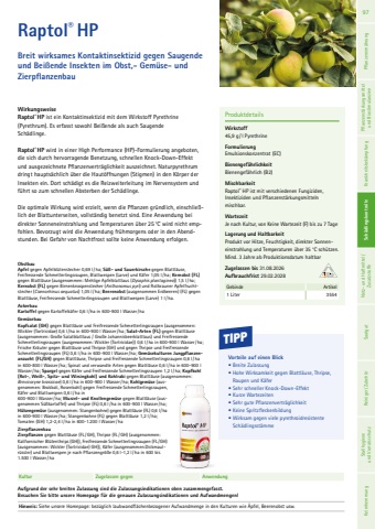 Raptol%u00ae HPBreit wirksames Kontaktinsektizid gegen Saugende und Bei%u00dfende Insekten im Obst,- Gem%u00fcse- und ZierpflanzenbauWirkungsweiseRaptol%u00aeHP ist ein Kontaktinsektizid mit dem Wirkstoff Pyrethrine (Pyrethrum). Es erfasst sowohl Bei%u00dfende als auch Saugende Sch%u00e4dlinge.Raptol%u00aeHP wird in einer High Performance (HP)-Formulierung angeboten, die sich durch hervorragende Benetzung, schnellen Knock-Down-Effekt und ausgezeichnete Pflanzenvertr%u00e4glichkeit auszeichnet. Naturpyrethrum dringt haupts%u00e4chlich %u00fcber die Haut%u00f6ffnungen (Stigmen) in den K%u00f6rper der Insekten ein. Dort sch%u00e4digt es die Reizweiterleitung im Nervensystem und f%u00fchrt so zum schnellen Absterben der Sch%u00e4dlinge.Die optimale Wirkung wird erzielt, wenn die Pflanzen gr%u00fcndlich, einschlie%u00dflich der Blattunterseiten, vollst%u00e4ndig benetzt sind. Eine Anwendung bei direkter Sonneneinstrahlung und Temperaturen %u00fcber 25 %u00b0C wird nicht empfohlen. Bevorzugt wird die Anwendung fr%u00fchmorgens oder in den Abendstunden. Bei Gefahr von Nachtfrost sollte keine Anwendung erfolgen.ObstbauApfel gegen Apfelbl%u00fctenstecher 0,69 l/ha; S%u00fc%u00df- und Sauerkirsche gegen Blattl%u00e4use, Freifressende Schmetterlingsraupen, Blattwespen (Larve) und K%u00e4fer 1,05 l/ha; Kernobst (FL)gegen Blattl%u00e4use (ausgenommen: Mehlige Apfelblattlaus (Dysaphis plantaginea)) 1,5 l/ha; Kernobst (FL) gegen Birnenknospenstecher (Anthonomus pyri) und Rotbrauner Apfelfruchtstecher (Caenorhinus aequatus) 1,05 l/ ha; Beerenobst (ausgenommen Erdbeeren) (FL) gegen Blattl%u00e4use, Freifressende Schmetterlingsraupen und Blattwespen (Larve) 1 l/ha.AckerbauKartoffel gegen Kartoffelk%u00e4fer 0,6 l/ha in 600-900 l Wasser/ha Gem%u00fcsebauKopfsalat (GH) gegen Blattl%u00e4use und Freifressende Schmetterlingsraupen (ausgenommen: Wickler (Tortricidae) 0,6 l/ ha in 600-900 l Wasser/ha; Salat-Arten (FL) gegen Blattl%u00e4use (ausgenommen: Gro%u00dfe Salatblattlaus / Gro%u00dfe Johannisbeerblattlaus) und Freifressende Schmetterlingsraupen (ausgenommen: Wickler (Tortricidae)) 0,6 l/ha in 600-900 l Wasser/ ha; Frische Kr%u00e4uter gegen Blattl%u00e4use und Thripse (GH) und gegen Thripse und Freifressende Schmetterlingsraupen (FL) 0,6 l/ha in 600-900 l Wasser/ha; Gem%u00fcsekulturen Jungpflanzenanzucht (FL/GH) gegen Blattl%u00e4use, Thripse und Freifressende Schmetterlingsraupen 0,6 l/ ha in 600-800 l Wasser/ha; Spinat und verwandte Arten gegen Blattl%u00e4use 0,6 l/ha in 600-900 l Wasser/ha; Spargel gegen K%u00e4fer und Freifressende Schmetterlingsraupen 1,2 l/ ha; Kopfkohl (Rot-, Wei%u00df-, Spitz- und Wirsingkohl) und Kohlrabi gegen Blattl%u00e4use (ausgenommen: Brevicoryne brassicae) 0,6 l/ha in 600-900 l Wasser/ ha; Kohlgem%u00fcse (ausgenommen: Brokkoli, Rosenkohl) gegen Freifressende Schmetterlingsraupen, K%u00e4fer und Blattwespen 0,6 l/ ha in 600-900 l Wasser/ ha; Wurzel- und Knollengem%u00fcse gegen Blattl%u00e4use (ausgenommen S%u00fc%u00dfkartoffel) und Thripse (FL) 0,6 l/ha in 600-900 l Wasser/ ha; H%u00fclsengem%u00fcse (ausgenommen: Stangenbohne) gegen Blattl%u00e4use (FL) 0,6 l/ha in 600-900 l Wasser/ha; Stangenbohne (FL) gegen Blattl%u00e4use 1,2 l/ha; Tomaten (GH) 1,2-2,4 l/ha in 600-1.200 l Wasser/ha Zierpflanzenbau Zierpflanzen gegen Blattl%u00e4use (FL /GH), Thripse (FL /GH) (ausgenommen: Kalifornischer Bl%u00fctenthrips (GH)), Freifressende Schmetterlingsraupen (FL /GH) (ausgenommen: Wickler (Tortricidae) GH)), K%u00e4fer (ausgenommen:Dickmaulr%u00fcssler) und Blattwespen je nach Pflanzengr%u00f6%u00dfe 0,6 l-1,2 l/ha in 600 bis 1.500 l Wasser/ haProduktdetailsWirkstoff45,9 g /l PyrethrineFormulierungEmulsionskonzentrat (EC) Bienengef%u00e4hrlichkeit Bienengef%u00e4hrlich (B2) MischbarkeitRaptol%u00ae HP ist mit verschiedenen Fungiziden,Insektiziden und Pflanzenst%u00e4rkungsmittelnmischbar. Wartezeit Je nach Kultur, von Keine Wartezeit (F) bis zu 7 TageLagerung und HaltbarkeitProdukt vor Hitze, Feuchtigkeit, direkter Sonneneinstrahlung und Temperaturen %u00fcber 35 %u00b0C sch%u00fctzen. Mind. 3 Jahre ab Produktionsdatum haltbar Zugelassen bis 31.08.2026Aufbrauchfrist 29.02.2028Gebinde Artikel1 Liter 3554Kultur Zugelassen gegen AnwendungHinweis: Siehe unsere Homepage: bez%u00fcglich laubwandfl%u00e4chenbezogener Aufwandmenge in den Kulturen wie %u00c4pfel, Beerenobst usw.TIPPVorteile auf einen Blick%u2022 Breite Zulassung%u2022 Hohe Wirksamkeit gegen Blattl%u00e4use, Thripse,Raupen und K%u00e4fer%u2022 Sehr schneller Knock-Down-Effekt%u2022 Kurze Wartezeiten%u2022 Sehr gute Pflanzenvertr%u00e4glichkeit%u2022 Keine Spritzfleckenbildung%u2022 Wirksam gegen viele pyrethroidresistente Sch%u00e4dlingsst%u00e4mmeAufgrund der sehr breiten Zulassung sind die Zulassungsindikationen oben zusammengefasst. Besuchen Sie bitte unsere Homepage f%u00fcr die genauen Zulassungsindikationen und Aufwandmengen! 97 Pflanzenern%u00e4hrung Pflanzenst%u00e4rkungsmittel und Biostimulanzien Krankheitsbek%u00e4mpfung Sch%u00e4dlingskontrolle Netz- und Haftmittel/ Zusatzstoffe Saatgut Reiniger/ Zubeh%u00f6r Sch%u00e4dlingskontrolle Stallhygiene und Vorratsschutz Keimhemmung